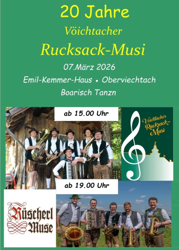 Ab 19 Uhr sorgt dann die „Rüscherl Muse“ für weitere musikalische Höhepunkte. Neben bester Musik dürfen sich die Besucherinnen und Besucher auf Volkstanz, gute Laune und ein geselliges Miteinander freuen. Denn auch zu ihrem 20-jährigem Jubiläum verspricht die Vöichtacher Rucksack- Musi, für was sie von jeher steht: „a bissl Tradition, a bissl Party und ganz vül Herz“. Herzliche Einladung ergeht an alle Volkstänzer, Musikbegeisterte, Weg Begleiter und alle Interessierten. Der Unkostenbeitrag beträgt zehn Euro.