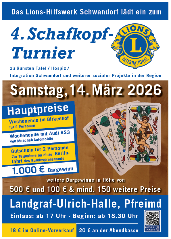 Das Lions Hilfswerk lädt nun bereits zum vierten Mal zu seinem beliebten Benefiz-Schafkopfturnier ein. Am 14. März 2026 werden in der Landgraf-Ulrich-Halle in Pfreimd viele Spieler den Titel um den besten Schafkopfer austragen. Die Veranstaltung beginnt um 18:30 Uhr, die Türen öffnen sich bereits um 17:00 Uhr zum Warmspielen.