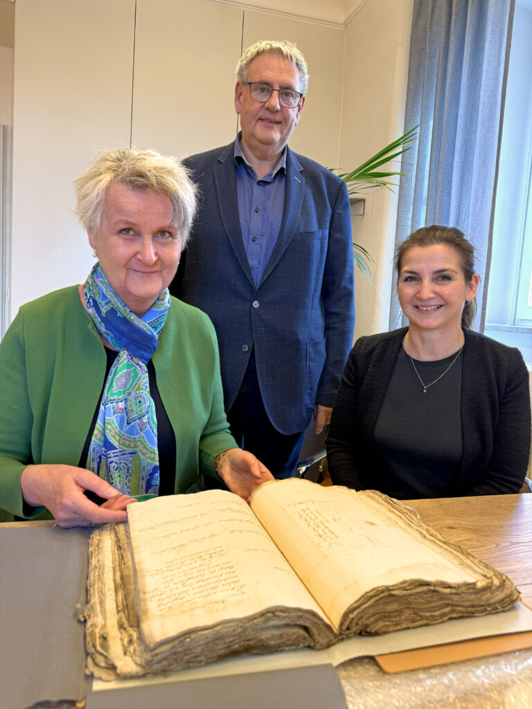Übergabe_Archivale_(c)_Doris_Wirth.jpg: Archivdirektorin Dr. Maria Rita Sagstetter (links) überreichte das 400 Jahre alte Archivale an Bürgermeister Herbert Tischhöfer und Stadtarchivarin Dr. Katja Putzer. Foto: Doris Wirth