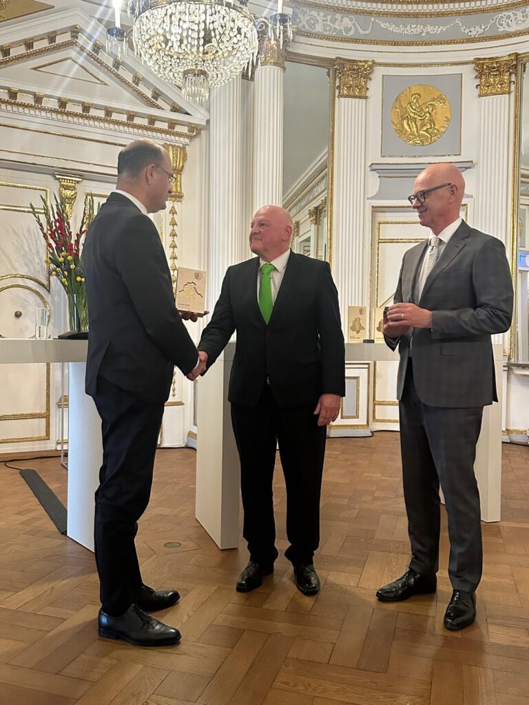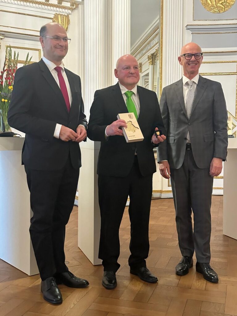 Albert Füracker, Bayerischer Staatsminister für Finanzen und der Heimat, und Walter Jonas, Regierungspräsident der Oberpfalz, nahmen die Auszeichnung vor. „Als gebürtiger Regensburger liebe ich meine Heimatstadt, die Oberpfalz und die Menschen, die hier leben. Rückgrat meiner Aktivitäten sind meine Frau und mein Laufteam“, freute sich Armin über die Auszeichnung.