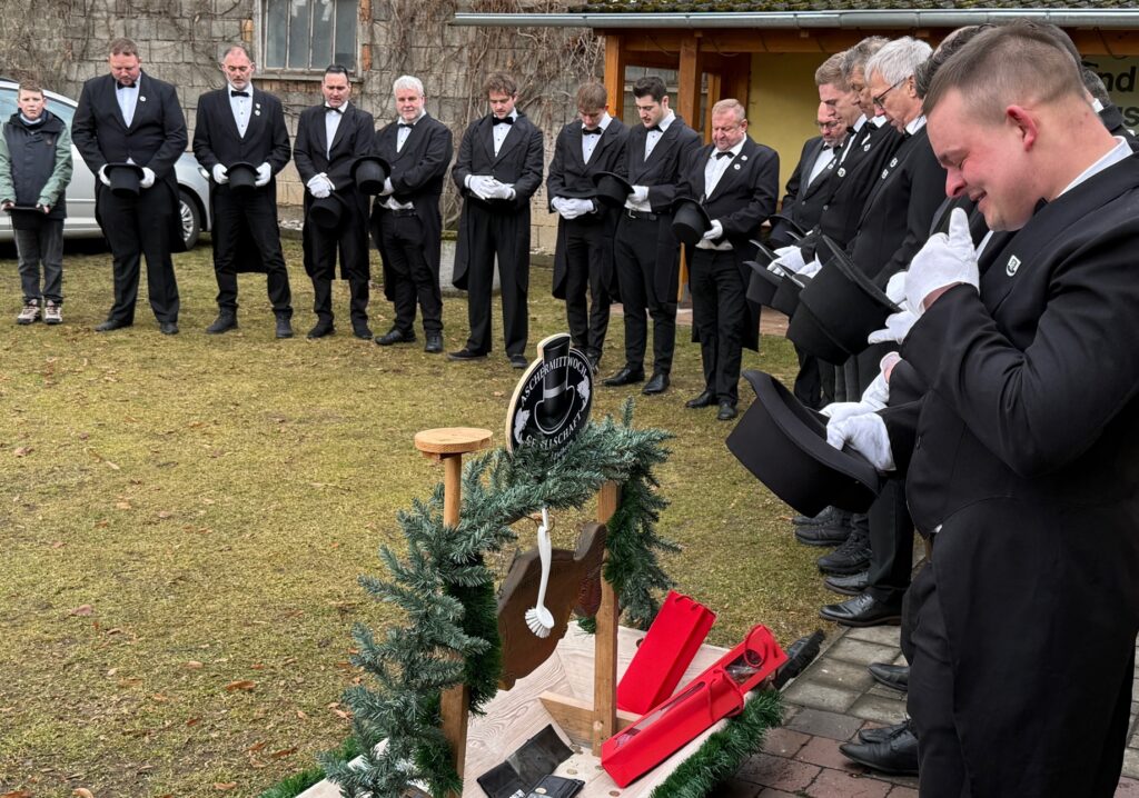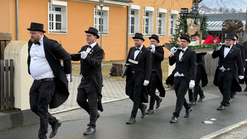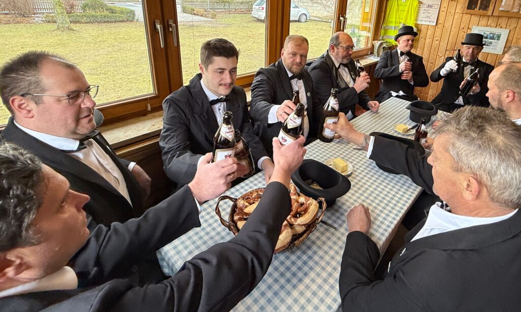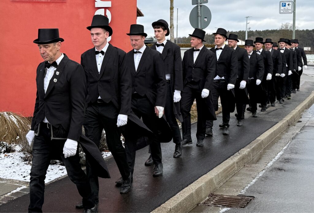 Die Trauergemeinde hat heuer einen erfreulichen Zuwachs bekommen. Neun junge Männer haben sich der Gemeinschaft angeschlossen, so dass diesmal 25 im Frack und Zylinder gekleidete Männer sich schweigend auf den Weg machten. Der traditionelle Fischzug läuft verschiedene Stationen an, wo das vom Fasching übrig gebliebene Bier getrunken wird. Startpunkt ist Punkt 9:09 Uhr im Eisstockheim des TSV Klardorf, so sehen es die Stauten vor. Die Trauergemeinde unter der Führung von Präsident Florian Mulzer wurde hier vom Stockschützen Georg Hien begrüßt. Dieser hatte als erster Gastgeber ausreichend Bier und Fischsemmeln bereitgestellt.