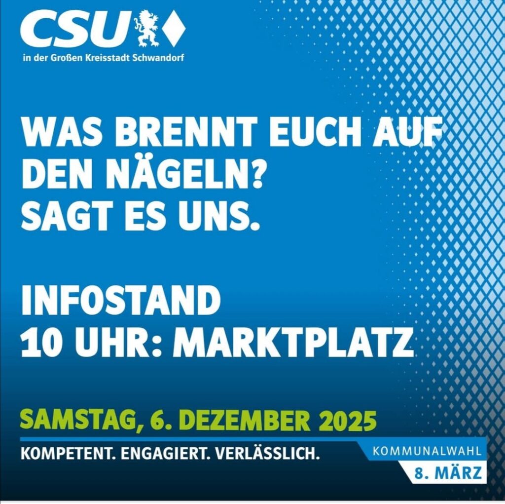 Am Samstag, 06.12.2025, stehen Oberbürgermeisterkandidat Andreas Wopperer und die Stadtratskandidaten der CSU von 10 bis 12 Uhr am Marktplatz in Schwandorf für Fragen und Anregungen zur Verfügung. Passend zur Jahreszeit wird Glühwein ausgeschenkt werden.