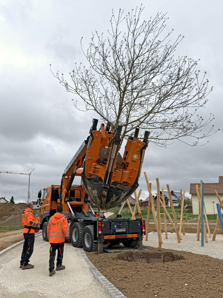 Aktuell werden junge Bäume und Sträucher gepflanzt sowie Rasenflächen angesät. Damit die Kinder aber von Anfang an im Schatten größerer Bäume spielen können, entschied sich die Stadt für einen besonderen und nachhaltigen Weg: die Umsiedlung ausgewachsener heimischer Bäume.