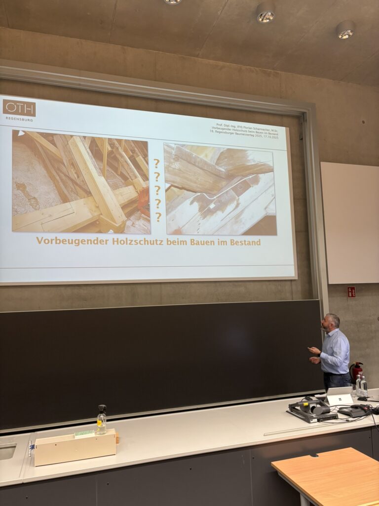 Den Auftakt des fachlichen Programms gestaltete Prof. Dipl.-Ing. Florian Scharmacher mit einem Vortrag über vorbeugenden Holzschutz beim Bauen im Bestand. Anhand anschaulicher Praxisbeispiele verdeutlichte er, wie Normen in der Baupraxis erfolgreich angewendet werden können. Anschließend berichtete Dipl.-Ing. Wolfgang Kugler über Subsidiärtragwerke in historischen Dachstühlen am Beispiel der Kirche St. Oswald in Regensburg, von der Planung bis hin zur Ausführung.