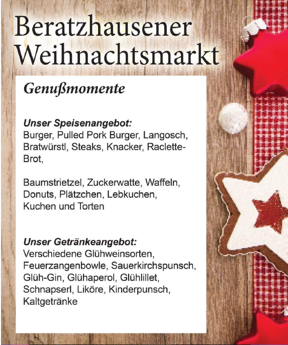 Der stimmungsvolle Beratzhausener Weihnachtsmarkt lädt am Samstag, den 7. Dezember und am Sonntag, den 8. Dezember ein. Der stimmungsvolle Weihnachtsmarkt bietet ein abwechslungsreiches Programm für Groß und Klein.