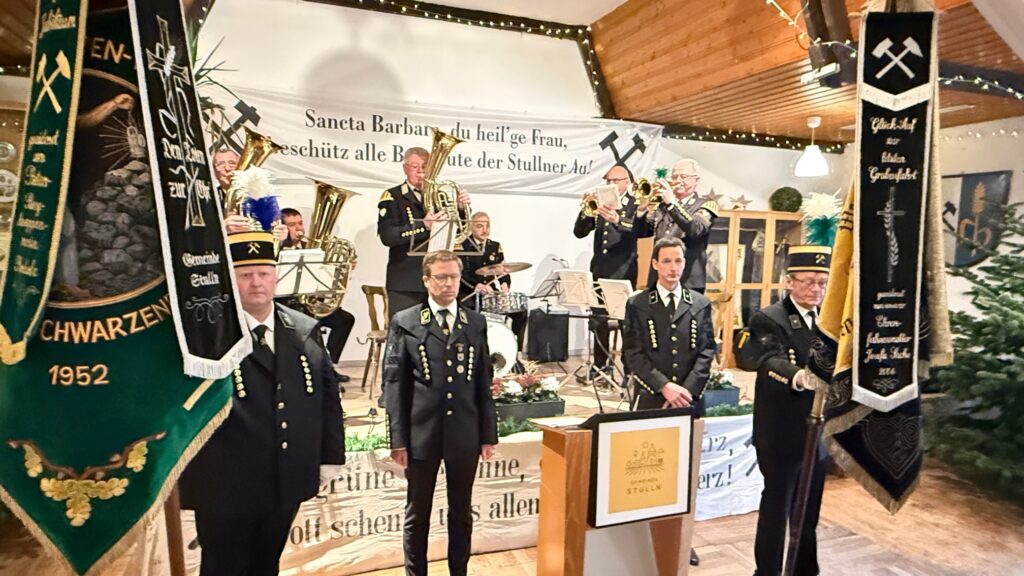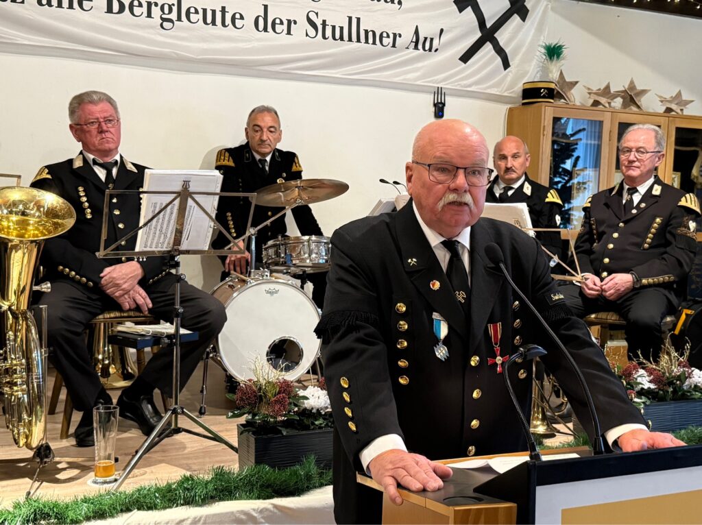 Bei der anschließenden weltlichen Feier im Gasthaus Bodensteiner in Stulln begrüßte die Bergmannskapelle Schwarzenfeld musikalisch die Teilnehmer. Jürgen Ferschl, Vorsitzender des BkV Stulln-Schwarzenfeld, richtete ein herzliches „Glück auf“ an den Ehrenvorsitzenden Wilhelm Hauser, das Ehrenmitglied Hermann Neidl sowie die außerordentlichen Mitglieder Alois Singer, Matthias Bodensteiner und Leo Zweck. Ein besonderer Gruß ging an Hans-Jürgen Reitzenstein, Vertreter des Landesverbandes Bayern und Mitglied des Bundesvorstandes „Deutscher Bergmanns-, Knappen- und Hüttenmännischer Vereine“. Als weitere Gäste aus der Politik wurden Landrat Thomas Ebeling, Hans Prechtl, Bürgermeister der Gemeinde Stulln, sowie Peter Neumeier, Bürgermeister des Marktes Schwarzenfeld, willkommen geheißen. Wolfgang Lehner, Vorsitzender des BkV Marienschacht Wölsendorf, begrüßte zusätzlich die Ehrenmitglieder Alois Singer und Johann Obendorfer sowie den Stollenbesitzer Johann Bauer und Pfarrer Maximilian Moosbauer.