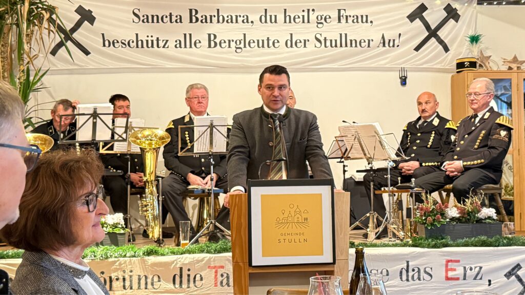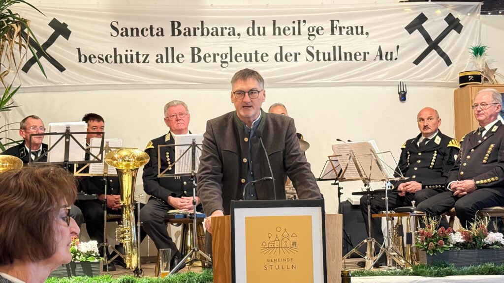 Nach dem Totengedenken dankte Landrat Thomas Ebeling den beiden Vereinen für ihr Engagement. „Ihr haltet die Bergbautradition im Landkreis Schwandorf hoch, die lange Jahre die Grundlage unseres Wohlstands war und viele Spuren hinterlassen hat“, betonte der Landkreischef in seinem Grußwort. In der Aufrechterhaltung der Erinnerung sieht der Landkreischef eine wichtige Aufgabe. Stullns Bürgermeister Hans Prechtl lenkte den Blick auf die drei Gemeinden, in denen Spuren des Bergbaus zu finden sind. Für Schwarzenfeld stehe die große Mineraliensammlung mit vielen Fotos im Rathaus; für die Gemeinden Stulln und Schwarzach verwies Prechtl auf das jeweilige Gemeindewappen, die Symbole des Bergbaus zeigen. Der Bürgermeister erinnerte auch daran, dass vor 25 Jahren die Bergknappenvereine Stulln und Schwarzenfeld fusioniert haben. Beide Vereine wurden 1952 gegründet. „Die Fusion war eine vorausschauende und richtige Entscheidung“, sagte Prechtl und überreichte dem Vorsitzenden Jürgen Ferschl eine 250-Euro-Spende. Dieser kündigte an dieser Stelle noch ein weiteres Jubiläum an: „2027 werden wir das 75-jährige Gründungsfest gebührend feiern.“