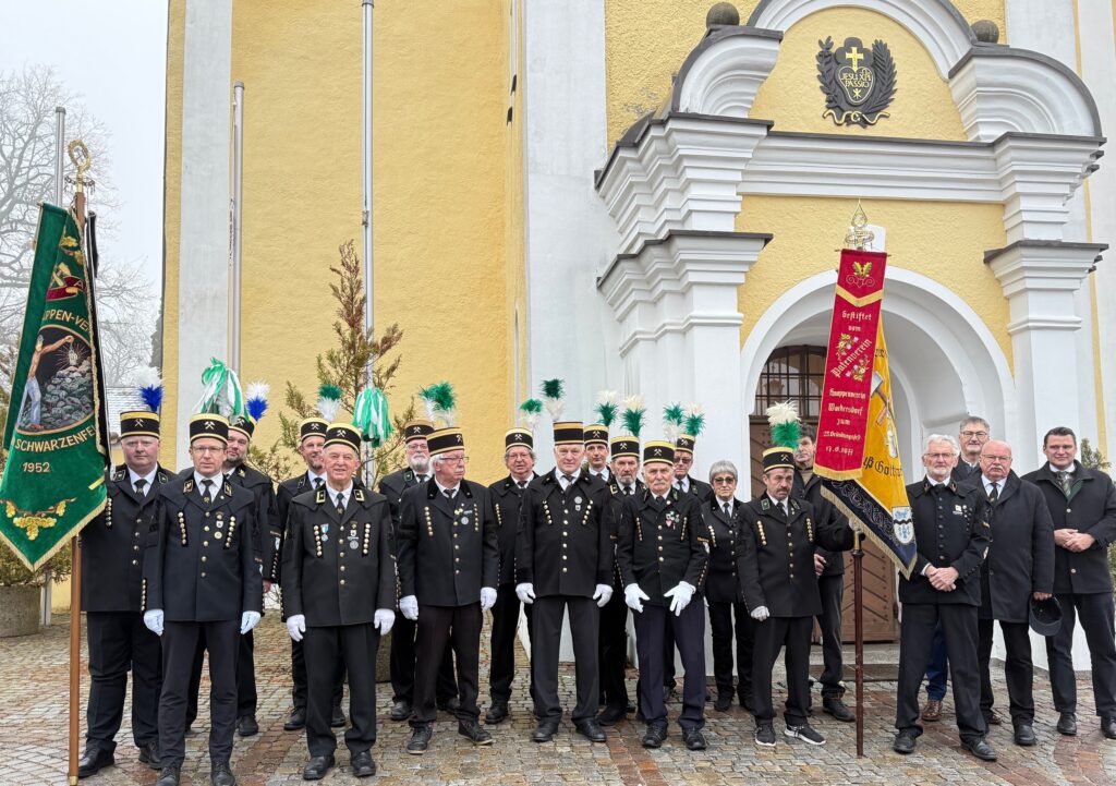 Stulln/Schwarzenfeld/Wölsendorf. Den höchsten Festtag eines Bergmanns, die Barbarafeier, feiern die beiden Bergknappenvereine (BkV) Stulln-Schwarzenfeld und Marienschacht Wölsendorf traditionsgemäß seit vielen Jahren gemeinsam. Zu Ehren der Heiligen Barbara wurde in der Dreifaltigkeitskirche auf dem Miesberg von Pater Alban ein Festgottesdienst zelebriert. Gemeinsam zogen die Mitglieder in ihren schmucken Uniformen und die Fahnenabordnungen in das Gotteshaus ein, wo der Bergchor St. Barbara die Messe gesanglich umrahmte.