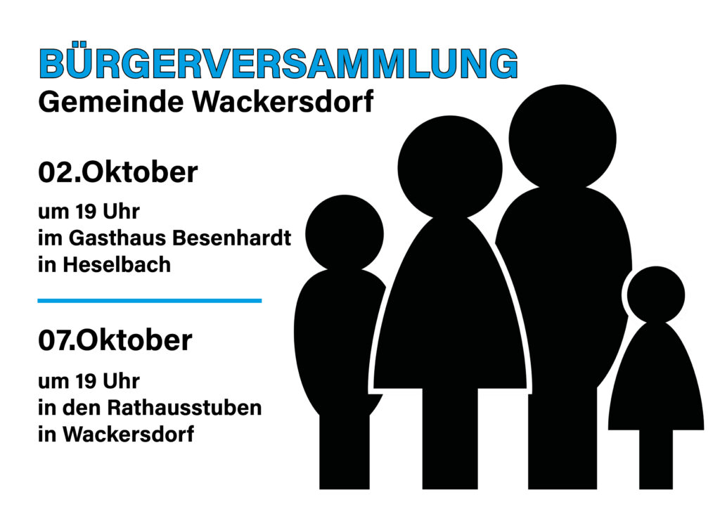 Am 2. und 7. Oktober finden die diesjährigen Bürgerversammlungen der Gemeinde Wackersdorf statt. Zu beiden Veranstaltungen möchten wir Sie hiermit einladen. Details zu den Einzelterminen entnehmen Sie bitte der folgenden Übersicht.