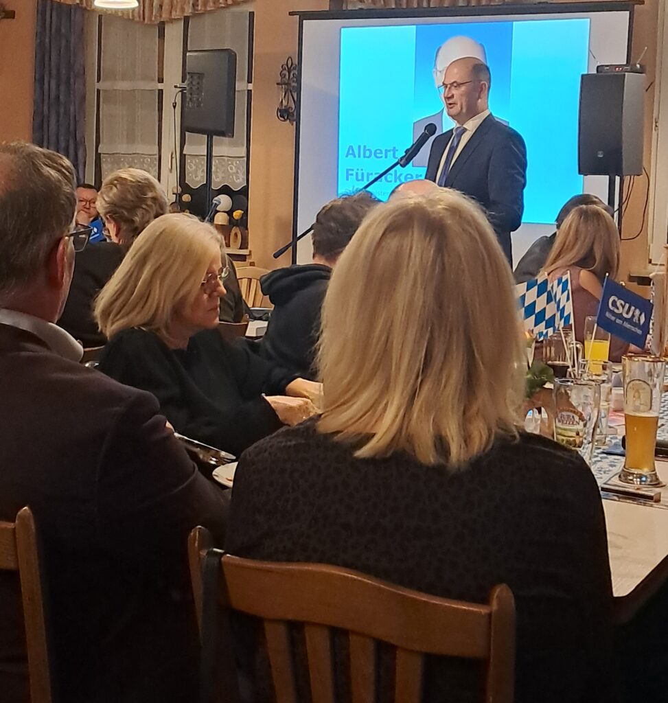 CSU-Ortsvorsitzender Albert Herzog begrüßte neben dem Ehrengast auch Landrat Thomas Ebeling und seinen Stellvertreter Jakob Scharf, MdL Alexander Flierl. FU-Kreisvorsitzende Jenny Lehmer, den Nittenauer CSU-Bürgermeisterkandidaten Albert Meierhofer mit seinem Ortsverband sowie den Ortsverband Bleich-Kaspeltshub und zahlreiche Stadt- und Kreistagskandidaten. Albert Hezog gab einen Rückblick über die Geschichte der „Schwarzen“ in Fischbach. Die Gründung erfolgte am 30. Juni 1946 mit dem 1. Vorsitzenden Xaver Schmid aus Nerping und dem 1912 geborenen Johann Lang als erstes Mitglied.1956 folgte ihm Lorenz Drexler, der bis 1985 den Ortsverband führte. Franz Jobst stand dann bis zu seinem tragischen Verkehrstod 1996 an der Spitze. Seitdem führt Albert Herzog den Ortsverband. 1984 gründete man auch einen JU-Ortsverband, den es aber schon länger nicht mehr gibt. Es habe in den acht Jahrzehnten viele Ereignisse gegeben, wobei in jüngerer Zeit vor allem der Einsatz für den Erhalt der Grundschule im Fokus stand. Die Unterstützung aller Ortsvereine sei immer ein Schwerpunkt gewesen. Zuletzt habe man sich um die Gestaltung des Dorfplatzes und das „langjährige Streitobjekt Schreinerhaus“ bemüht. Momentan gehe es um die Ausweisung und Gestaltung eines Bau- und Gewerbegebietes, die Sicherung der Grundversorgung, eventuell auch mit einem Dorfladen.