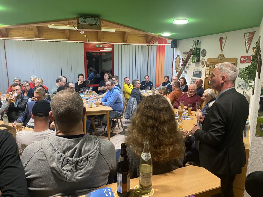 Erzhäuser: „Wow – unglaublich, mit so vielen Gästen hätte ich nicht gerechnet“, meinte ein sichtlich zufriedener Bürgermeister Georg Hoffmann (CSU) am Montagabend bei der Fortsetzung der „Machen ist besser als Wollen“-Tour im überfüllten Sportheim des SV Erzhäuser. Tatsächlich, normalerweise passen knapp 50 Personen ins SV-Heim, gestern dürften es einige mehr gewesen sein, da hinter und neben der Theke etliche Zuhörer stehend die Versammlung verfolgten. Sicherlich hat der Geburtstag des Gemeindeoberhaupts, der am Montag 53 Jahre alt wurde, und die in Aussicht gestellte Geburtstags-Brotzeit für den einen oder anderen zusätzlichen Gast gesorgt. Besonders willkommen hieß Hoffmann Altbürgermeister Albert Bauer und Landrat Thomas Ebeling.