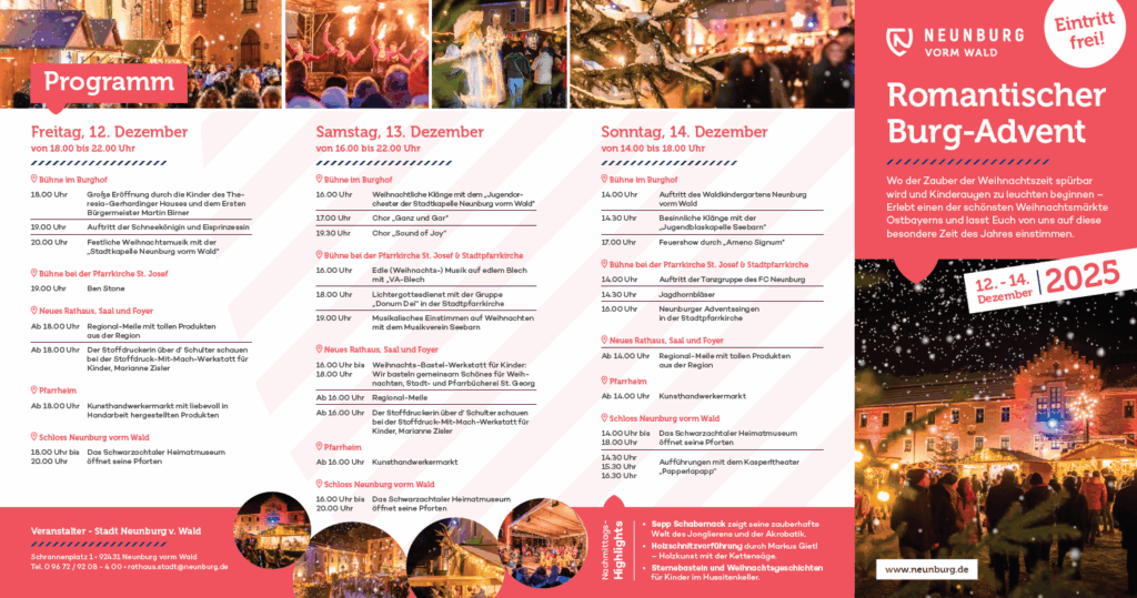 Am dritten Adventswochenende erstrahlt Neunburg vorm Wald mit seinem historischen Burghof und dem dazugehörigen Schloss wieder im Glanz unzähliger Lichter. Damit findet vom 12. bis zum 14. Dezember einer der schönsten Weihnachtsmärkte Ostbayerns statt. Über 50 Aussteller aus der Region begrüßen Sie täglich bei freiem Eintritt und bieten eine Vielfalt an regionalen sowie liebevoll von Hand hergestellten Produkten. Lassen Sie sich von Kunsthandwerkern, Direktvermarktern und vielen weiteren Mitwirkenden auf diese besondere Zeit des Jahres einstimmen. Denn hier in Neunburg wird der einzigartige Zauber der Weihnachtszeit spürbar.