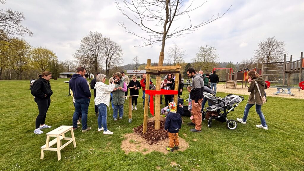 Ein besonderer Höhepunkt der Veranstaltung war die feierliche Enthüllung der Plakette mit den Namen der Jahrgangskinder. Im Anschluss durften die Kinder selbst aktiv werden. Mit kleinen Gießkannen, die als Erinnerungsgeschenk bereitgestellt wurden, halfen sie dabei, den frisch gepflanzten Baum zu wässern. Der Moment sorgte bei Familien und Gästen gleichermaßen für Freude.
