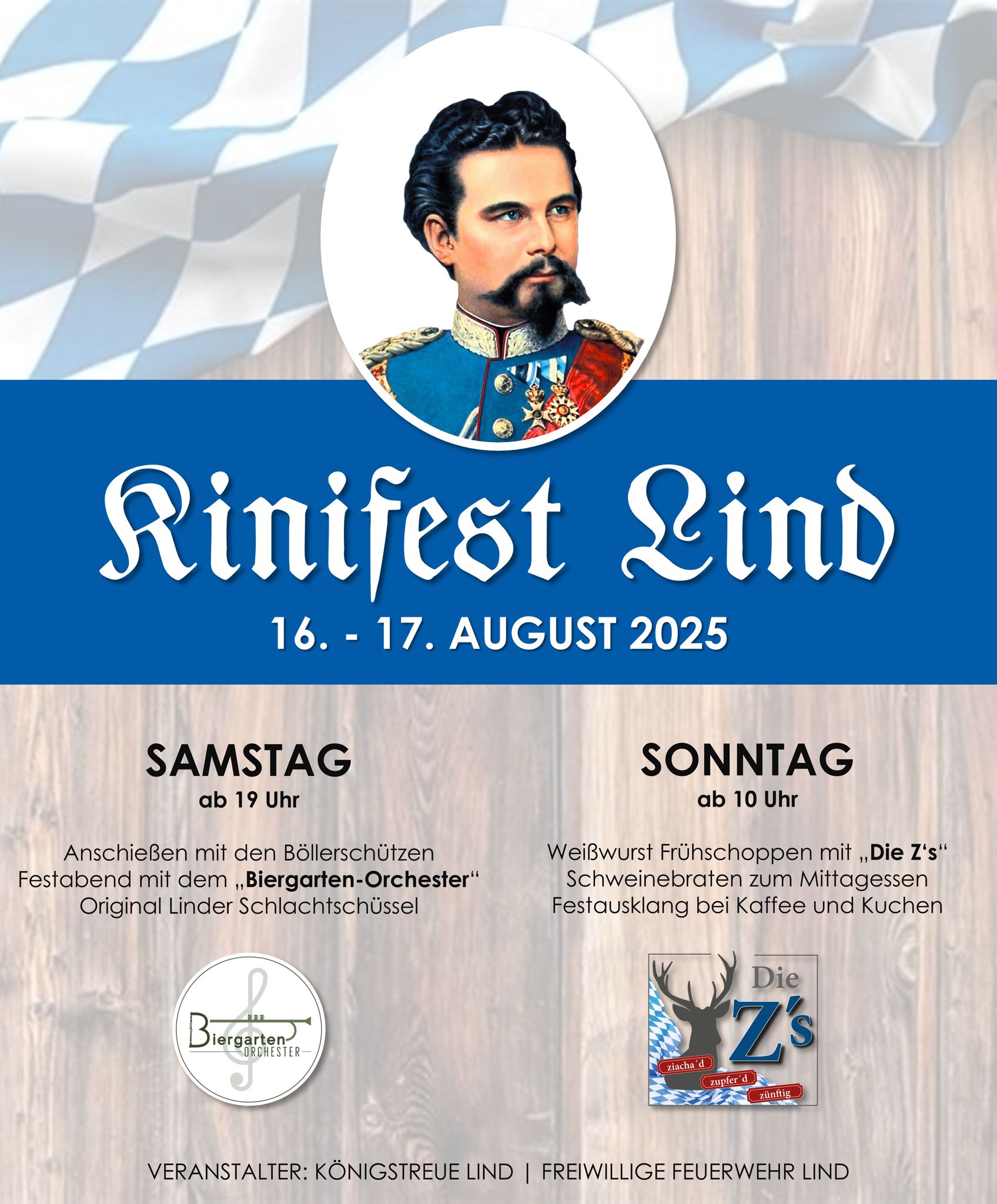Am 16. und 17. August 2025 feiert Lind bei Oberviechtach zu Ehren unseres Märchenkönigs Ludwig II. ein Fest in der Dorfmitte, wie es königlicher kaum sein könnte. Der Samstagabend beginnt ab 19 Uhr mit den Böllerschützen und es wird gefeiert mit dem Biergarten-Orchester und der legendären Linder Schlachtschüssel. Der Sonntag beginnt ab 10 Uhr mit einem Weißwurst-Frühschoppen, musikalisch begleitet von den „Z’s“. Ein festlicher Mittag mit Schweinebraten und ein süßer Ausklang bei Kaffee und Kuchen runden das königliche Wochenende ab. Kommen Sie vorbei und lassen sich königlich verwöhnen.