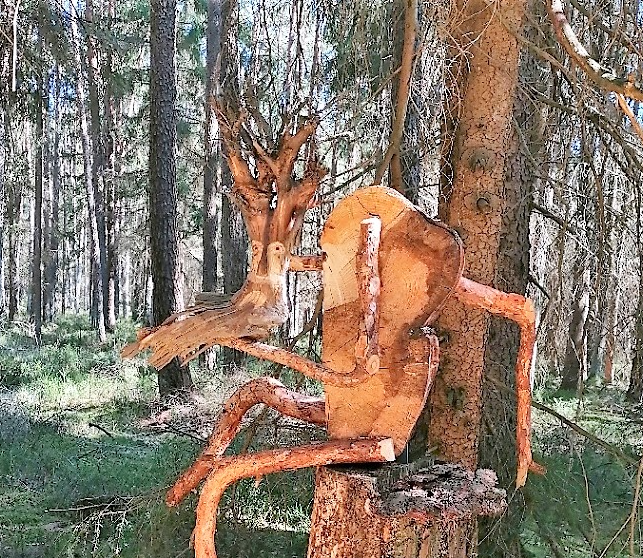 Das Waldschrat-Duo „Elvis“ und „Ringo“ empfängt uns mit Gitarre und Flöte. An der nächsten Kreuzung werden wir von der Monsterspinne „Arachnid“ und dem Affen Herr Nilsson empfangen. Plötzlich huscht „Jurassic“, ein 4 Meter langer Wurzel-Saurier, über den Weg. Damit kann er „Rapunzel“, die auf einem Baumstumpf sitzende Baumscheiben-Oma jedoch nicht erschrecken. Wieder bei der Drei-Linden-Hütte angekommen, treffen wir den Baumscheiben-Bär „Balu“, der uns zum Abschied zuwinkt.