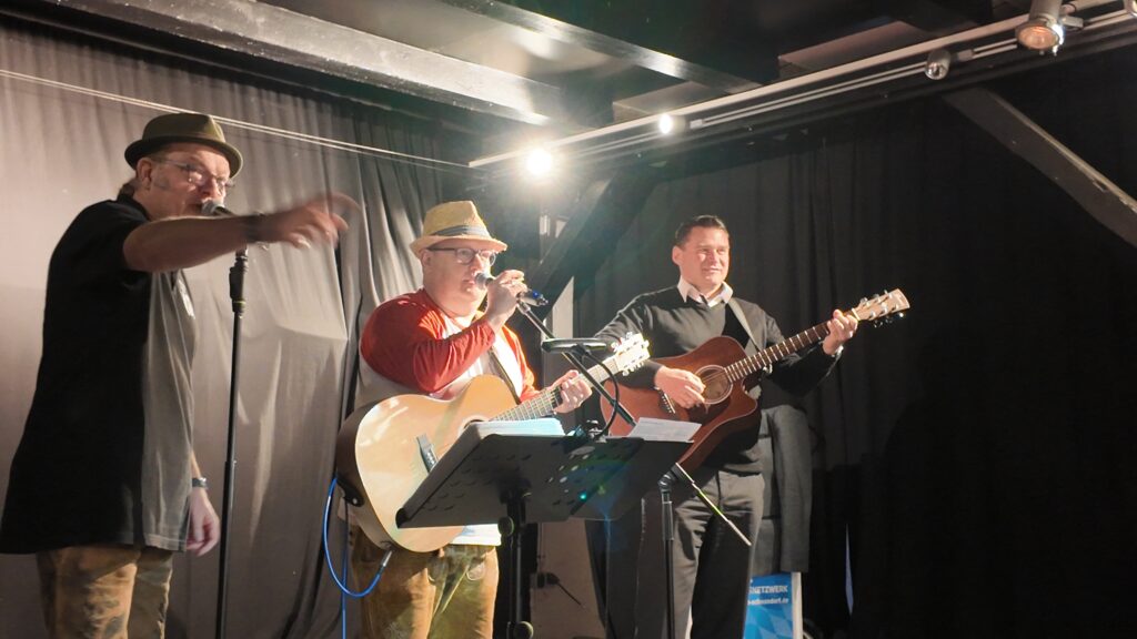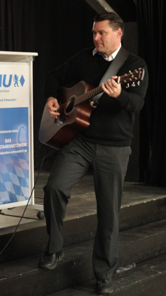 Freilich durfte auch Thomas Ebeling nicht ohne eine Portion Spott davonkommen. „Ich bau dir an Sitzungssaal“ trällerten Haider und Karl ebenso wie das Lied der Bee Gees „How deep is your love“ (auf Bayerisch: „Ich mag Thomas Ebeling“). Große Begeisterung rief schließlich hervor, als Ebeling sich ebenfalls auf die Bühne begab und zur Ibanez-Gitarre griff. Bereits bei „9 und 9 Paulus“ spielte der Landrat mit. Großes musikalisches Können bewies er beim „Metallica“-Klassiker „Nothing else matters“, wo er gefühl- und kraftvoll Soli und Begleitung spielte, während Haider den Text in „Du bleibst unser Landrat“ umwandelte.