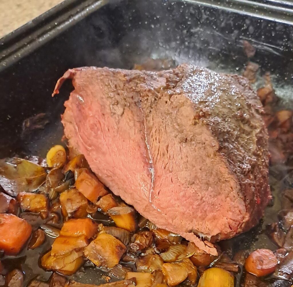 Dann das Fleisch in Scheiben schneiden. Im Schnellkochtopf dauert der Braten circa zwischen 30 und 40 Minuten.