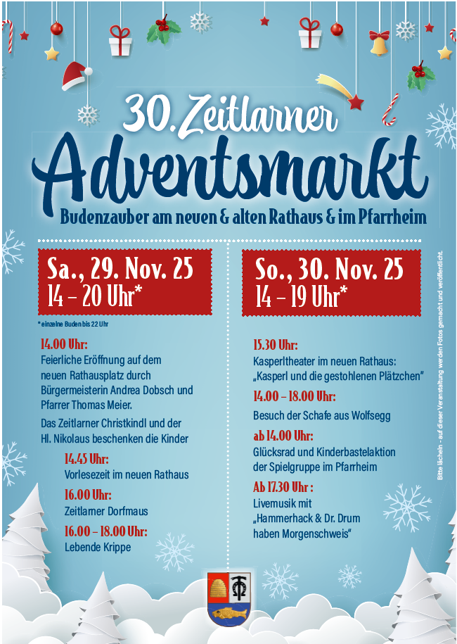 Der feierliche Auftakt findet am Samstag, 29. November, um 14 Uhr auf dem neuen Rathausplatz statt. Bürgermeisterin Andrea Dobsch und Pfarrer Thomas Meier eröffnen gemeinsam den Markt, begleitet vom Zeitlarner Christkindl, dem Heiligen Nikolaus und seinen Engerln, dem Kinderchor Zeitlarn sowie der Feuerwehrblaskapelle. Danach verteilt der Nikolaus kleine Geschenke an die Kinder.