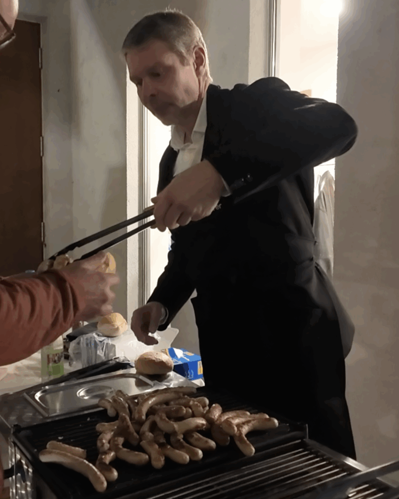 Nach dem offiziellen Teil ging es an den Grill: Christian Paulus überreichte Klaus Holetschek und Andreas Wopperer als Gastgeschenke bestickte Grillschürzen und personalisierte Grillzangen. Beide ließen es sich nicht nehmen, selbst zur Zange zu greifen – Bratwürste und Getränke rundeten einen interessanten Abend ab.