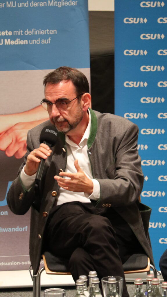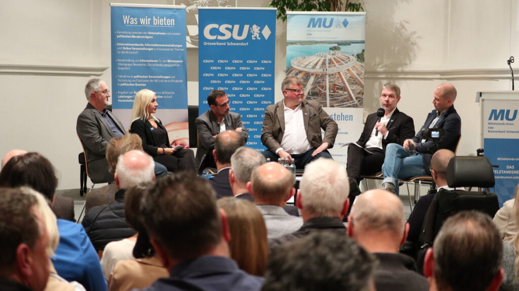 Auf dem Podium diskutierten CSU-Fraktionschef Klaus Holetschek, Bürgermeister und CSU-OB-Kandidat Andreas Wopperer, Andreas Betzlbacher (Sanitätshaus Betzlbacher), Immobilienmaklerin Sabriye Atas (RE/MAX) und Konditor und Gastronom Hans Brunner. Die Moderation übernahm Fabian Borkner, der die Gesprächsrunde souverän leitete – auch Fragen, die im Vorfeld von Bürgerinnen und Bürgern eingeschickt wurden, bezog er mit ein.
