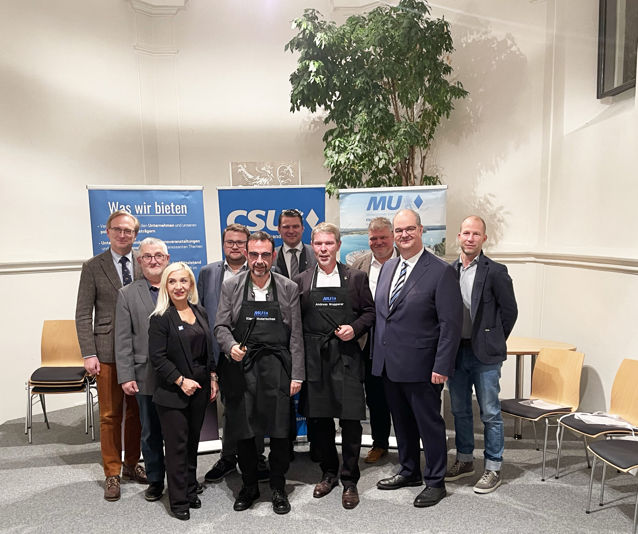Nach dem offiziellen Teil ging es an den Grill: Christian Paulus überreichte Klaus Holetschek und Andreas Wopperer als Gastgeschenke bestickte Grillschürzen und personalisierte Grillzangen. Beide ließen es sich nicht nehmen, selbst zur Zange zu greifen – Bratwürste und Getränke rundeten einen interessanten Abend ab.