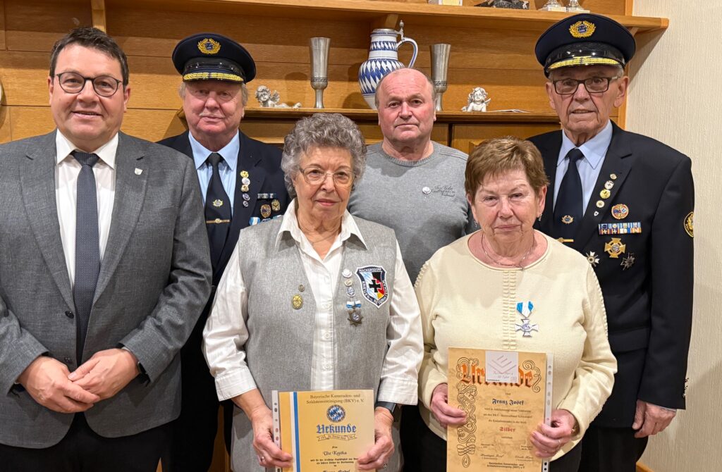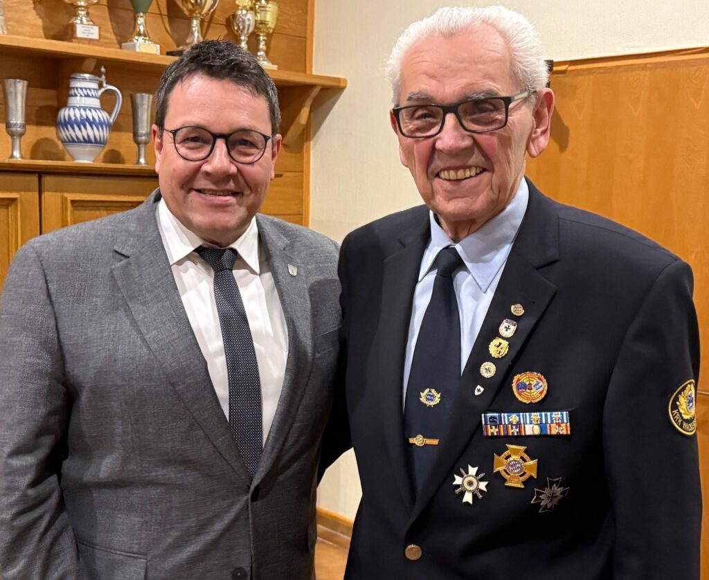 Erst kürzlich waren auch auf Landesebene die außergewöhnlichen Verdienste des 78-jährigen Josef Hartinger gewürdigt worden. Im Rahmen einer Sitzung der Bayerischen Kameraden- und Soldatenvereinigung ehrte BKV-Präsident Otmar Krumpholz seinen langjährigen Weggefährten für dessen vielfältiges Engagement auf allen Ebenen des Verbandes. Hartinger war von 2001 bis 2025 Mitglied des Präsidiums, 15 Jahre lang Landesprotokollführer, elf Jahre Ordenskanzler und von 2024 bis zu seinem Rückzug Großkanzler. Zudem fungierte er ein Jahr lang als stellvertretender Präsident. Als Anerkennung für sein jahrzehntelanges, außerordentliches Engagement wurde er nun zum Vize-Ehrenpräsidenten ernannt.
