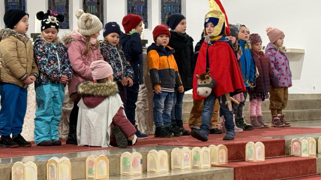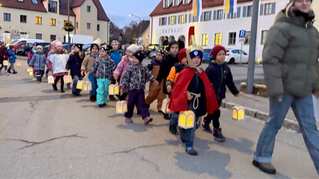 Mit großem Engagement spielten die Kinder die Geschichte der Mantelteilung nach und machten so die Botschaft des Teilens und der Nächstenliebe lebendig. Nach der kurzen Andacht marschierten die Kinder mit ihren Lampions zum Kinderhaus, fröhlich begleitet von Martinsliedern. Drei Mitglieder des Musikvereins sorgten unterwegs für die musikalische Begleitung des Zuges, während Eltern mit Kinderwägen hinterherliefen und den Laternenzug zu einem bunten, bewegten Lichtermeer machten.