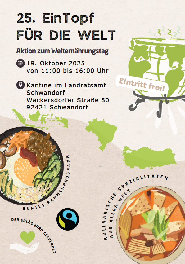 Anlässlich des Welternährungstags veranstaltet der Agenda-21-Arbeitskreis im Landkreis Schwandorf wieder seinen Aktionstag „EinTopf für die Welt“. Hierzu verwandelt sich die Kantine und der Sitzungssaal des Landratsamtes am Sonntag, 19. Oktober von 11-16 Uhr in eine Schlemmermeile, welche von einem bunten und abwechslungsreichen Informations- und Kulturprogramm begleitet werden wird.
