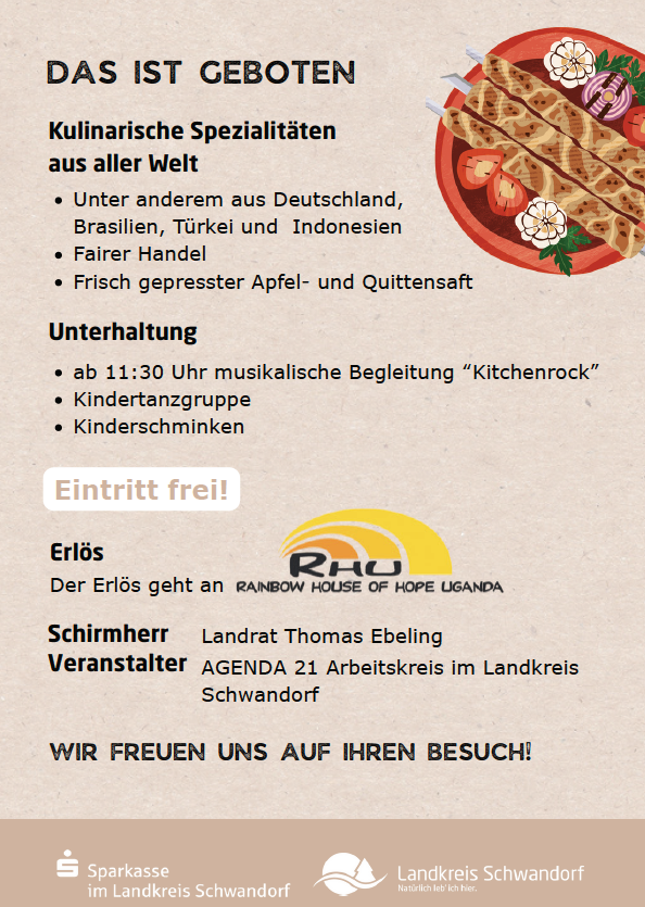 Für Unterhaltung sorgen die Kinder der Türkischen Gemeinde mit einem Folkloretanz, sowie die AWO-Tanzgruppe Grün-Weiß Oberviechtach und die Liveband KitchenRock aus Neumarkt. Kinder können sich schminken lassen oder die leckere Zuckerwatte probieren. Traditionell wird der gesamte Erlös für ein soziales Projekt gespendet. In diesem Jahr kommt der Erlös Rainbow House of Hope, einem Bildungsförderprojekt für benachteiligte junge Menschen in Uganda zugute. Landrat Thomas Ebeling und der Leiter des Agenda-21-Arbeitskreises, Manuel Lischka, laden im Namen aller Beteiligten die Bevölkerung recht herzlich zum Aktionstag „EinTopf für die Welt“ am 19. Oktober ins Landratsamt Schwandorf ein.