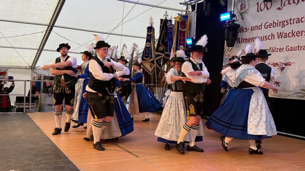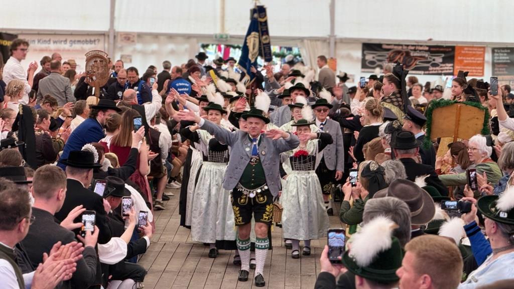 Beim feierlichen Einzug in das Festzelt wurden insbesondere die Fahnenträger begeistert empfangen, bevor sie sich auf der Bühne zur gemeinsamen Trachtenhymne versammelten. Den stimmungsvollen Abschluss des Festtages bildeten die Ehrentänze des Jubelvereins gemeinsam mit seinen Gastvereinen.