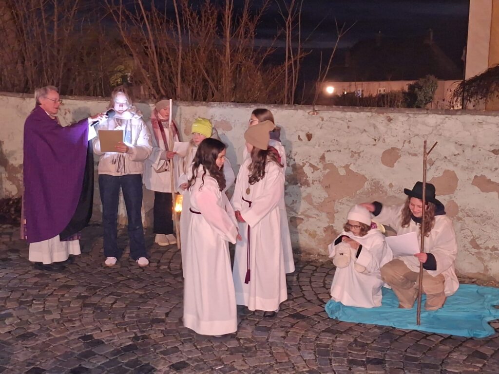 Am Samstagabend war die Pfarrei St. Leonhard unterwegs zum Heiligen Abend. Begleitet wurde die große Schar von Gläubigen von dem kleinen Hirtenjungen Simon, der sich auf die Suche nach seinem verlorenen Schäfchen machte. Um gut durch die Dunkelheit zu kommen, hatte er 4 Lichter mit auf den Weg bekommen. Unterwegs traf er auf einen verletzten Wolf, einen Dieb und einen Bettler, denen er mit seinem Licht Wärme, Hoffnung und Zuversicht spendete. Letztendlich fand Simon sein Schaf wieder im Stall an einer Krippe. Die letzte, nur noch leicht flackernde Kerze schenkte Simon dem Kind in der Krippe – und wie von unsichtbarer Hand flammte das Licht auf und ein Leuchten und Glanz erfüllte den ärmlichen Stall.