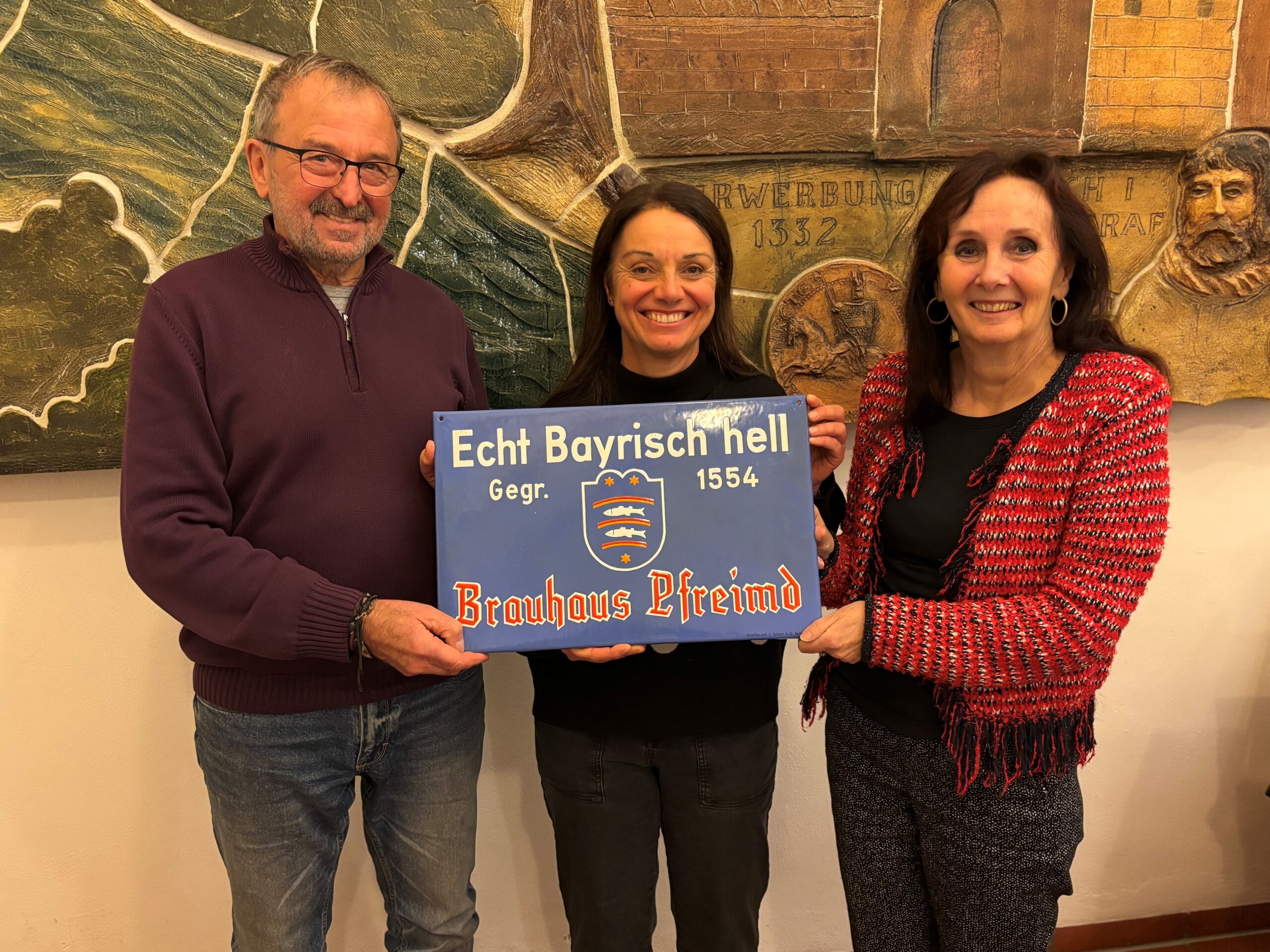 Mit einem neuen Exponat zur Pfreimder Brauerei-Geschichte überraschte die Vorstandschaft des Fördervereins Museumsleiterin Carola Reul zum Abschluss der Versammlung. Der Verein hat bei einer Internet-Auktion ein sehr gut erhaltenes Email-Schild vom Brauhaus Pfreimd ersteigert, das jetzt zum Fundus des Museums gehört.