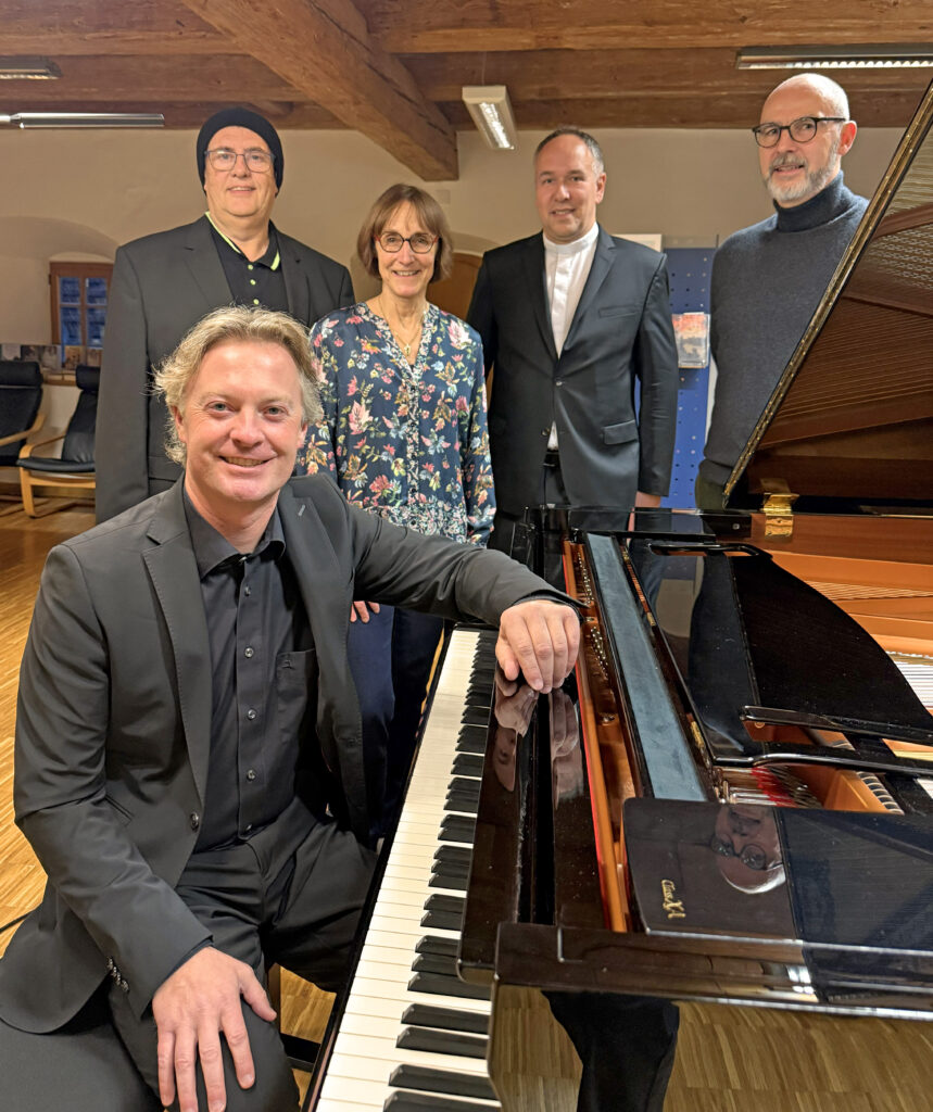 Vorne: Pianist Lukas Klotz. Hinten von links: Bürgermeister Herbert Tischhöfer, Bibliotheksleiterin Karola Künzl, Stadtpfarrer Berno Läßer und Kulturreferent Dr. Thomas Feuerer. Foto: Doris Wirth.