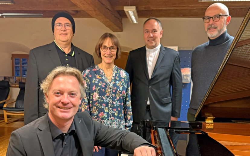 Vorne: Pianist Lukas Klotz. Hinten von links: Bürgermeister Herbert Tischhöfer, Bibliotheksleiterin Karola Künzl, Stadtpfarrer Berno Läßer und Kulturreferent Dr. Thomas Feuerer. Foto: Doris Wirth.