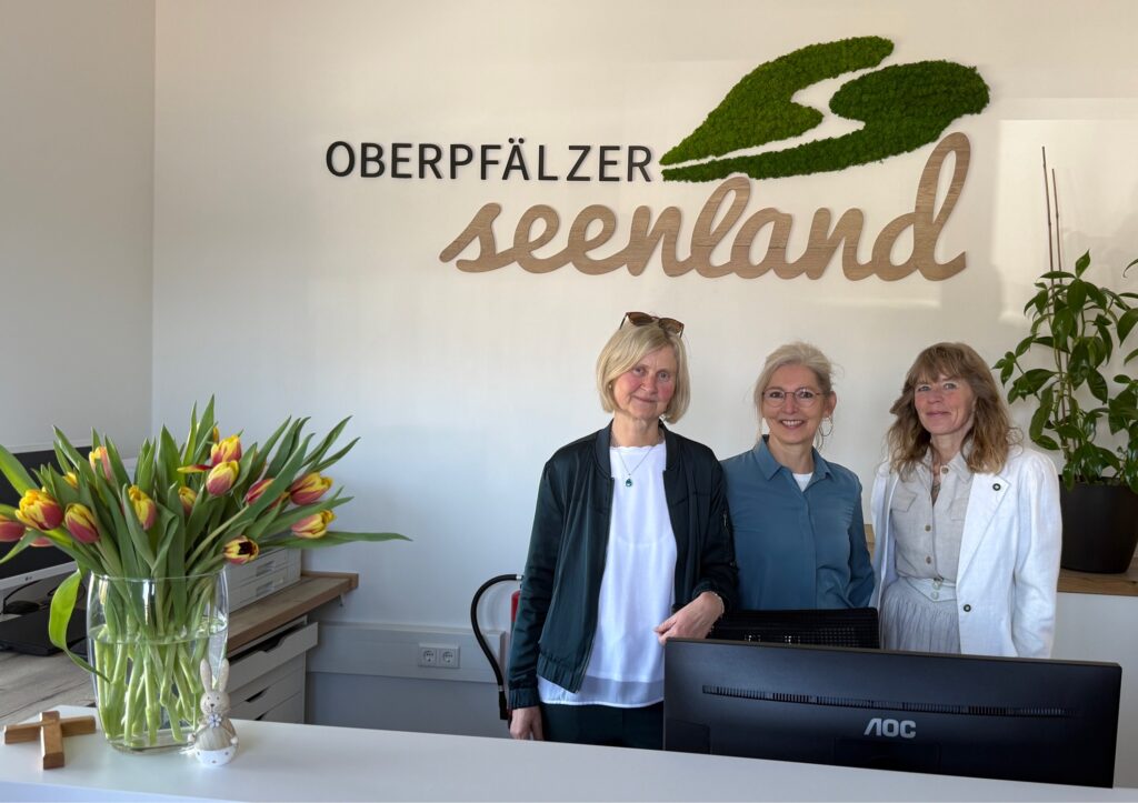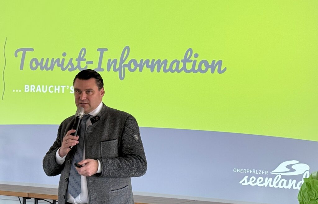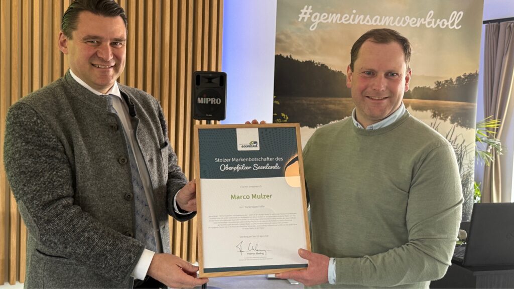 Im Anschluss an die Grußworte durchschnitten Ebeling und Bemmerl gemeinsam mit den Gästen symbolisch ein Band. Pfarrer Werner Sulzer segnete die neuen Räumlichkeiten, bevor die Anwesenden zu einem Rundgang eingeladen wurden. Zum Abschluss der Feierlichkeiten gab es noch eine besondere Auszeichnung: Marco Mulzer, Betreiber des Teichguts Mulzer im benachbarten Oberweiherhaus, wurde von Verbandsvorsitzendem Thomas Ebeling zum Markenbotschafter des Oberpfälzer Seenlands ernannt und erhielt eine entsprechende Urkunde. Geschäftsführer Johannes Lohrer überreichte ihm zudem einen Seenland-Liegestuhl. Im Anschluss nutzten Bürgermeister und Touristiker die Gelegenheit zum Austausch.