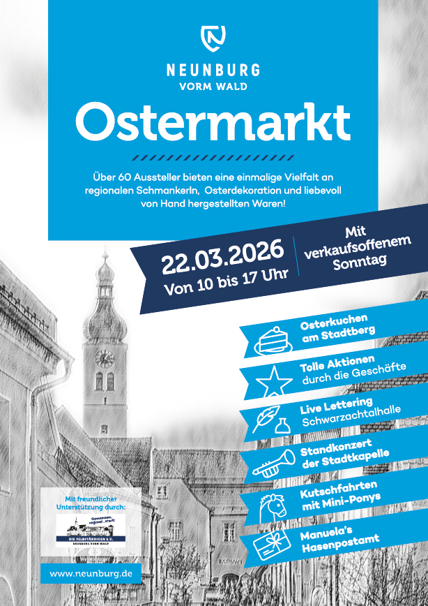 Wenn Ende März die ersten warmen Sonnenstrahlen kommen, liegt der Frühling spürbar in der Luft. Genau zwei Wochen vor Ostern, am Sonntag, den 22. März 2026, verwandelt sich die Stadt dann wieder in einen lebendigen Treffpunkt für Gäste aus der ganzen Region: Der traditionelle Neunburger Ostermarkt lädt von 10.00 bis 17.00 Uhr zum Bummeln, Entdecken und Genießen ein – mit über 65 Ausstellern so vielfältig wie noch nie.