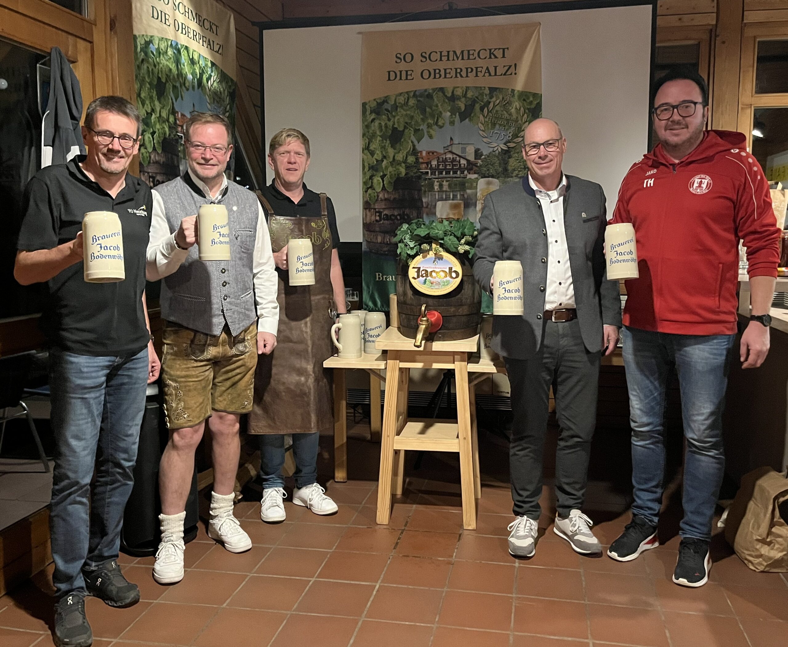 Am vergangenen Samstag machte sich eine Abordnung der Fußballabteilung des 1. FC Neunburg vorm Wald, angeführt von den Abteilungsleitern Thomas Habel und Christoph Steffens, Markus Lernbecher von der Familienbrauerei Jacob und Musikant Benjamin Maier auf den Weg zum Vereinsheim des Tennisclubs Neunburg vorm Wald .
