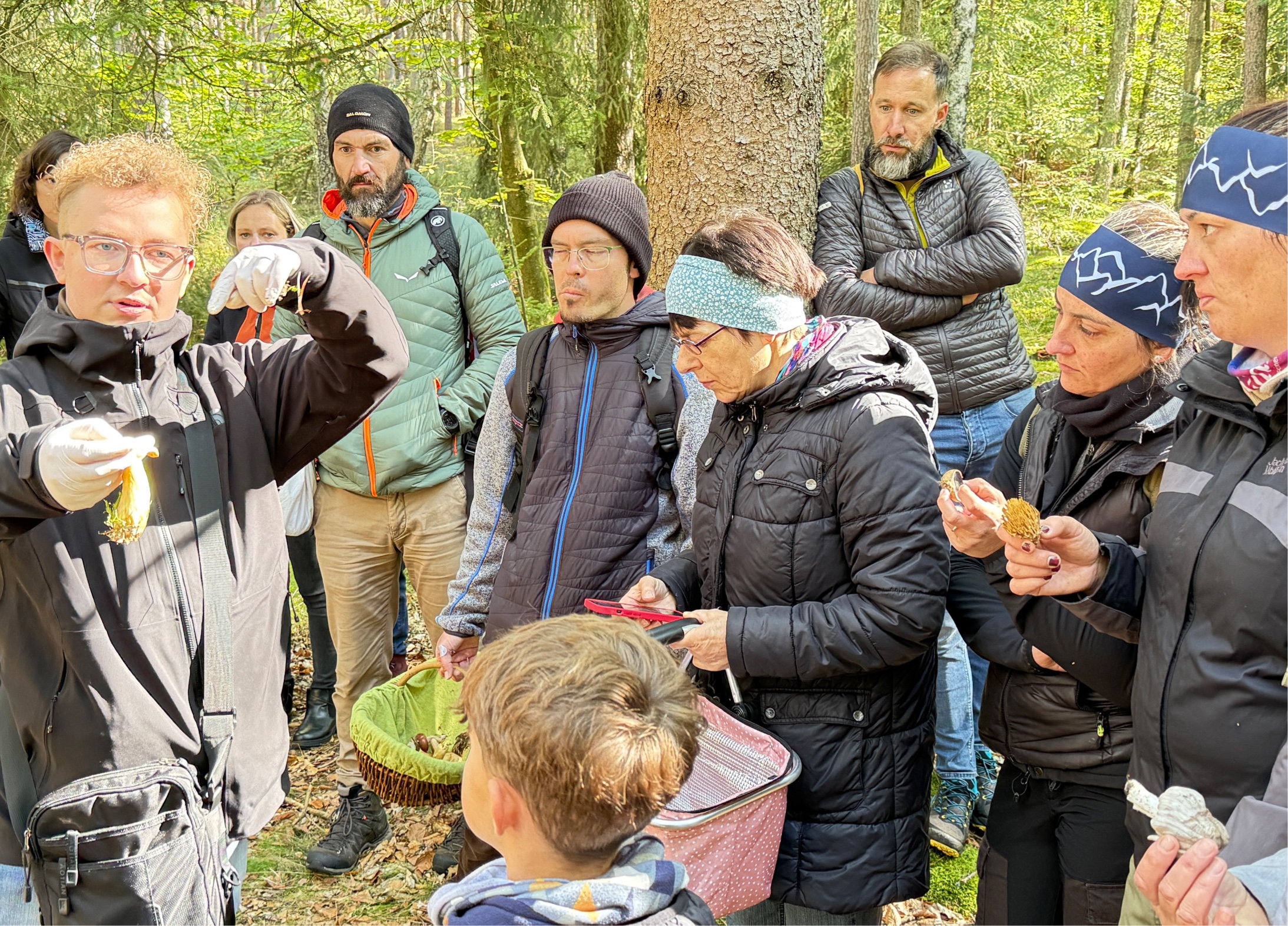 Nach einer kurzen Einführung in die Grundlagen der Pilzkunde, darunter die Unterscheidung von Hutpilzen, Röhrlingen, Lamellenpilzen und Vitalpilzen, begann die Wanderung bis zum Thundorfer Weiher. Bereits nach wenigen Metern konnten erste Exemplare entdeckt werden. Pilze suchen und finden macht bei Groß und Klein einfach Spaß. Pfifferlinge und Steinpilze sind weitgehend bekannt, doch es gab an diesem Vormittag noch vieles mehr zu entdecken. Trompeten-Pfifferlinge, Edelreizker und Hexenröhrling wurden gefunden. Am Beispiel eines grünen Knollenblätterpilzes mit seiner markanten Knolle sagte Hunzinger, das es wichtig ist, den Pilz herauszudrehen.