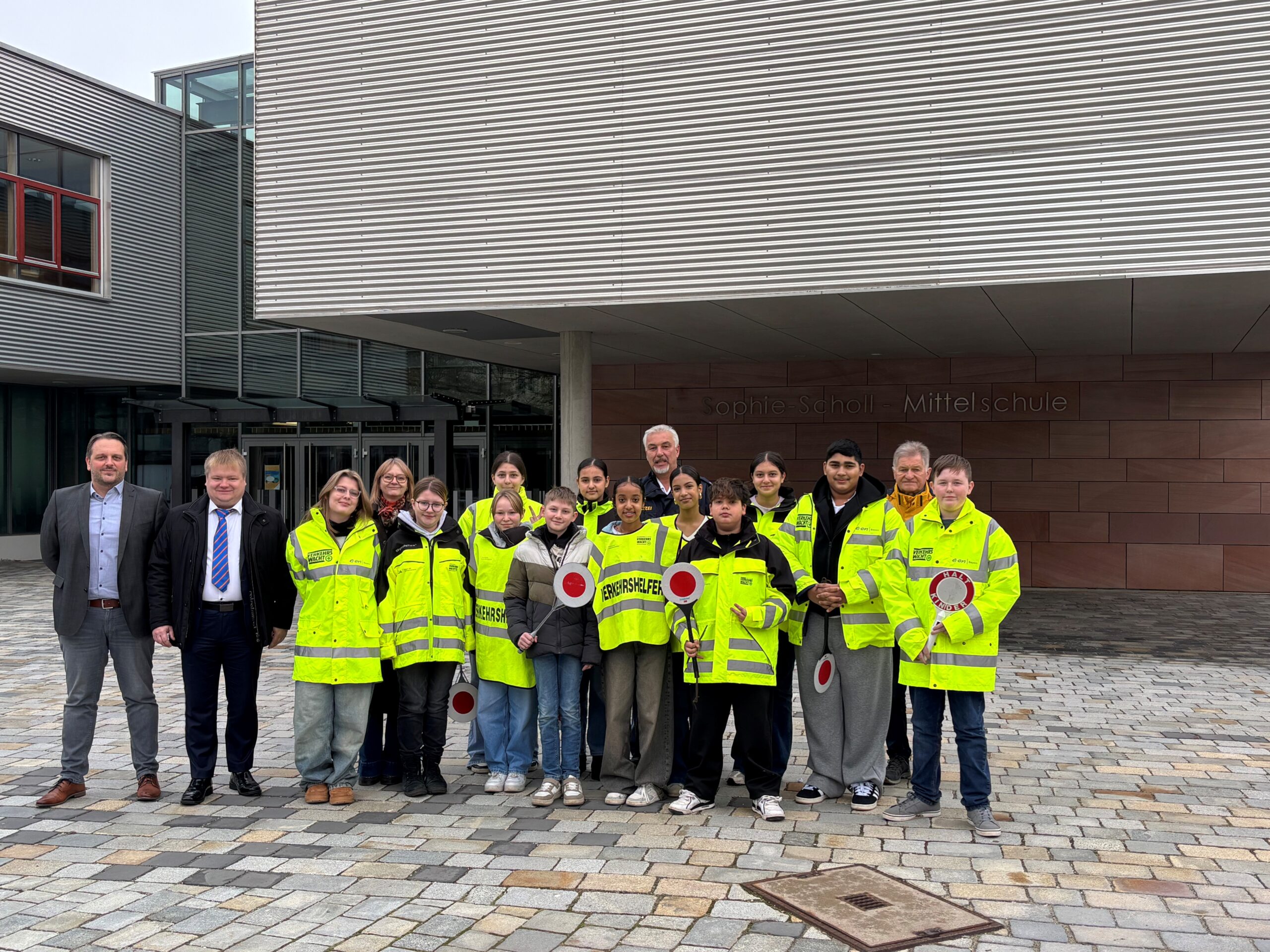 Auch Konrektor Stefan Schabl und Lehrerin Stephanie Jobst, die Schülerlotsenbeauftragte der Mittelschule, freuten sich über das Engagement der Jugendlichen. Neben der offiziellen Ausrüstung gab es für die neuen Schulweghelfer eine kleine Brotzeit und Getränke – ein Dankeschön für ihren Einsatz.