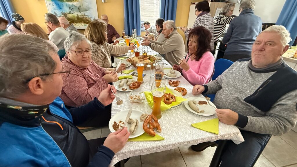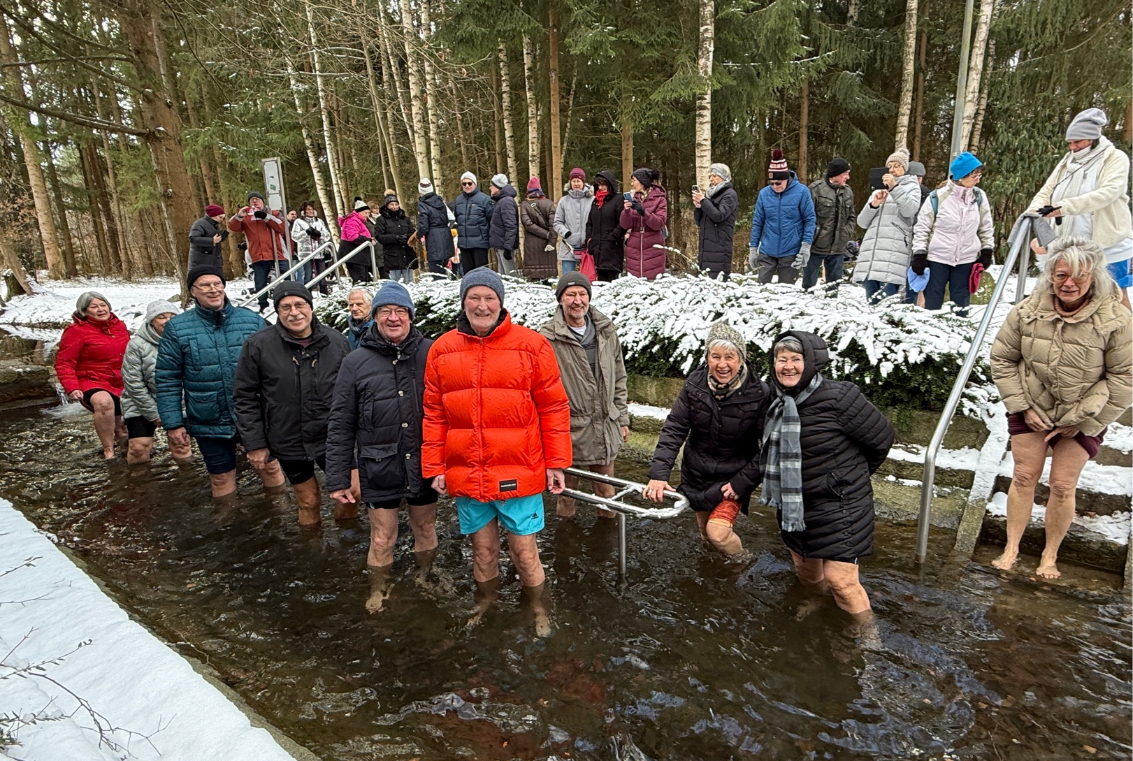 Nach einem kurzen Marsch zum See entledigten sich die abgehärteten Kneippianer ihrer Beinkleider und stiegen in das nur wenige Grad kalte Wasser. Bei minus drei Grad Lufttemperatur und eisigem Wind fröstelte es nicht nur die zahlreichen, warm eingepackten Zuschauer. „Ganz schön knackig kalt“, lautete das Fazit der Gäste aus der Domstadt. Nach zwei bis drei Runden durch das kalte Nass wurden rasch wieder warme Socken angezogen. Wer dennoch kalte Füße verspürte, brachte bei einer kurzen Wanderung zum Vereinsheim des Wassersportvereins Brücklsee die Durchblutung wieder in Schwung. Dort empfingen Vorsitzende Karin Roßmann und ihr Team die Teilnehmer zu einem gemeinsamen Weißwurstfrühstück.