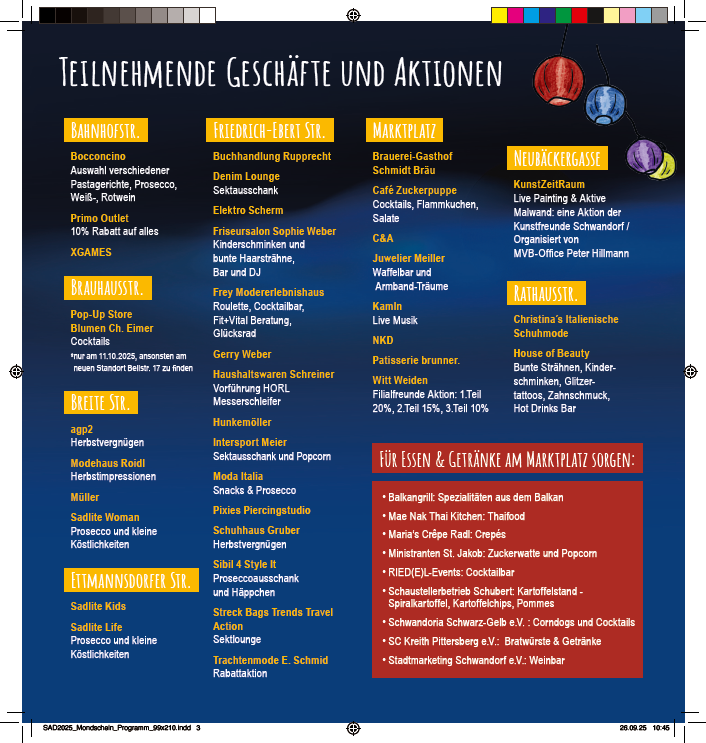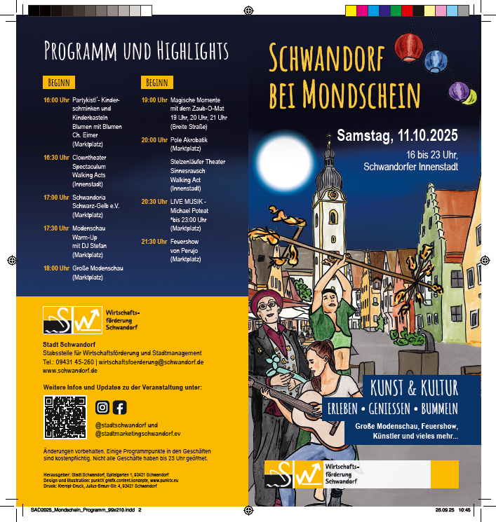 Besonderes Highlight ist die große Modenschau am Marktplatz, bei der ein 20 Meter langer Laufsteg zur Bühne für aktuelle Herbst- und Wintertrends wird. Präsentiert werden diese von Models aus Schwandorf. Doch damit nicht genug: Die Geschäfte öffnen ihre Türen bis 23 Uhr und überraschen mit besonderen Aktionen, Angeboten und Köstlichkeiten. „Wir möchten mit Schwandorf bei Mondschein zeigen, wie lebendig, kreativ und vielfältig unsere Innenstadt ist. Für jeden ist etwas dabei – ob Mode, Magie, Musik oder Mitmachaktionen für Kinder“, erklärt Stadtmanagerin Sonja Zindel.