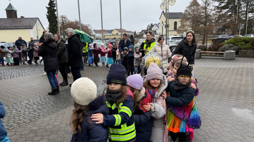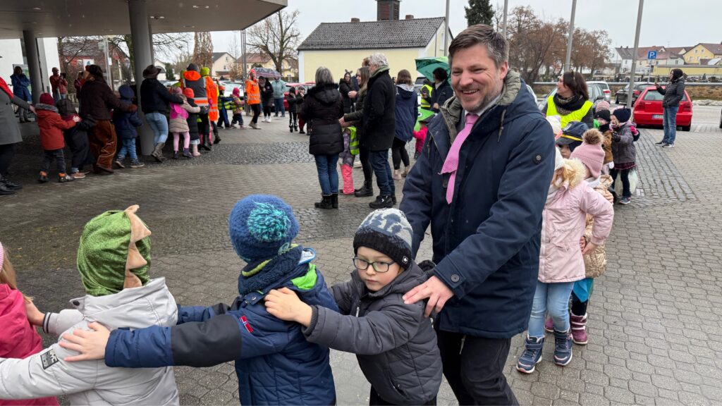 Ein besonderer Höhepunkt des Besuchs ließ nicht lange auf sich warten: Ganz nach alter Tradition musste Bürgermeister Peter Neumeier „Federn lassen“. Die rosafarbene Krawatte des Rathauschefs fiel der Schere von Paula Meier, Leiterin des gemeindlichen Kindergartens Villa Kunterbunt, zum Opfer. Unter dem begeisterten Applaus der Kinder wurde das gute Stück fachgerecht gekürzt – ein symbolischer Akt, der die närrische Machtübernahme der Kleinsten eindrucksvoll besiegelte. Bürgermeister Neumeier nahm es mit Humor und zeigte sich erfreut über die ausgelassene Stimmung. Im Anschluss an die „Amtshandlung“ verwandelte sich der Rathausvorplatz in eine kleine Faschingsbühne. Bei einer gemeinsamen Polonaise zogen die Kinder singend und lachend ihre Runden. Die fröhliche Musik und das ausgelassene Treiben lockte auch zahlreiche Schaulustige an. Den krönenden Abschluss bildete eine wohlverdiente Stärkung: Für alle kleinen Maschkerer gab es leckere Krapfen, die nach so viel Bewegung und Aufregung besonders gut schmeckten.