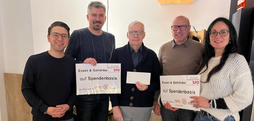 BURGLENGENFELD. Mit einer Spende in Höhe von 600 Euro unterstützt der SPD-Ortsverein Burglengenfeld die Arbeit der Schwandorfer Tafel, Ausgabestelle Städtedreieck. Bürgermeisterkandidat Martin Antretter überreichte die Spende an Franz Rother, Leiter der Ausgabestelle, zusammen mit den Ortsvorsitzenden Kerstin von Brincken und Peter Wein sowie 3. Bürgermeister Sebastian Bösl. Wie Martin Antretter informierte, stammt das Geld aus dem gut besuchten Oktoberfest des SPD-Ortsvereins: „Wir haben dabei ganz gezielt um Spenden für die Tafel gebeten.“