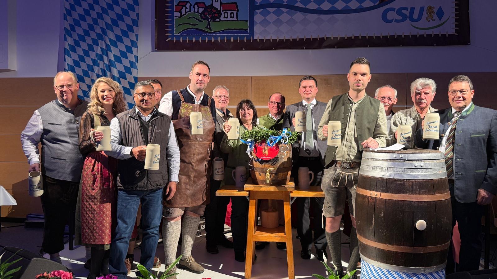 CSU-Ortsvorsitzender Fabian Kraus, der eingangs das gute Miteinander der Unionsfamilien Wackersdorf und Steinberg betonte, konnte dazu auch zahlreiche Politprominenz begrüßen, u. a. Landrat Thomas Ebeling, der in seinem Grußwort das Steinberger Starkbierfest als eines der ältesten im Landkreis lobte, sowie seine Stellvertreter Birgit Höcherl und Jakob Scharf (alle CSU), OB Andreas Feller (CSU) aus dem „Vorvorort Schwandorf“, Bürgermeister Thomas Falter „aus dem Vorort Wackersdorf“ sowie das örtliche Gemeindeoberhaupt Harald Bemmerl (SPD).