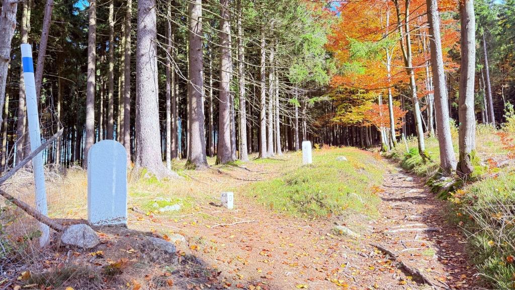 Nur ein Fußweg, die Sautreibergasse, begrenzt durch Grenzsteine und Weiß-Blaue Grenzpfähle, war die einzige Verbindung nach Schönsee und nach Stadlern. Der Grenzverlauf geht zurück auf die Zeit von Maria-Theresia, Königin von Ungarn und Böhmen, erläuterte Vize-Vorsitzender Konrad Bierlmeier. Auf diesem Hohlweg, auf dem einst auch die Pascher unterwegs waren, ging es für die Grenzgänger schließlich zurück über Friedrichshäng nach Plöß, einem weiteren untergegangenem Dorf an der tschechischen Grenze.