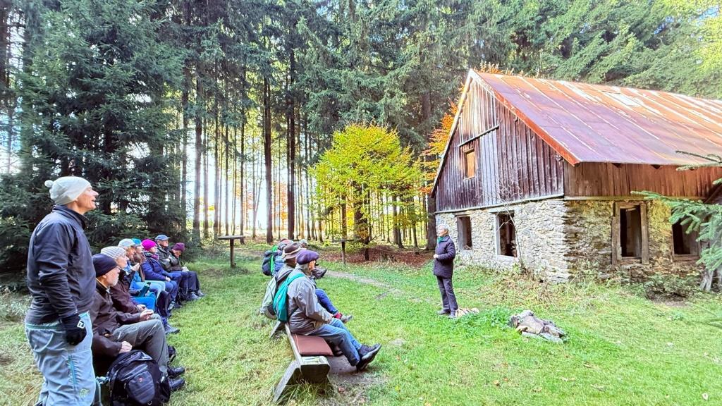 Im Sommer 1946 musste Maria Wachter ihre angestammte Heimat im Sudetenland verlassen. Lediglich 30 Kilo an Habseligkeiten durften die Flüchtlinge mitnehmen. In der nahe, auf bayerischer Seite, gelegenen Bügellohe, wollte man eine Rückkehr abwarten. „Die Deutsch-Böhmen richteten sich trotz harter Bedingungen ein so gut es ging“, erklärte Hammerer. Nachdem Wenzelsdorf niedergebrannt und viele andere Ortschaften dem Boden gleich gemacht wurden, schwand die Hoffnung auf eine Rückkehr. 1969 verließ der letzte Bewohner die Bügellohe, berichtete die Laienschauspielerin und gab der Besuchergruppe das Vermächtnis von Maria Wachter mit auf den Weg: „Deutsche und Tschechen sind durch die Geschichte miteinander verbunden. Versöhnt euch mit eurer Geschichte“.