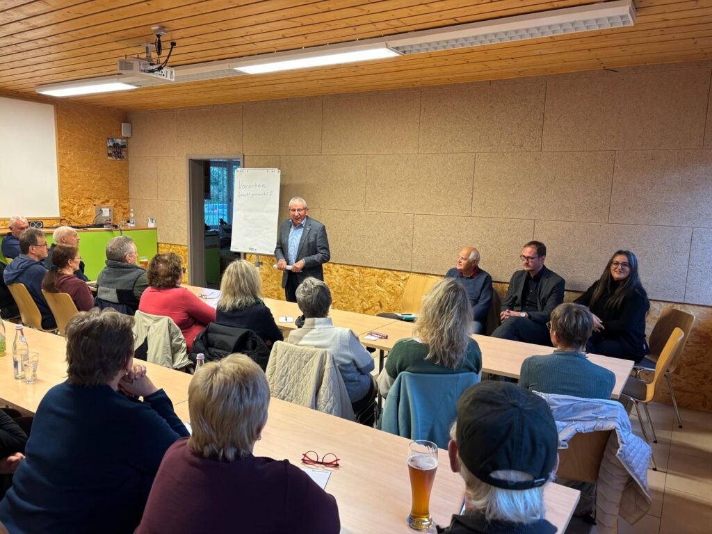 Man solle immer dann ein Testament aufsetzen, wenn man nicht an das Sterben denke, beteuerte Ruhland. Er erläuterte die Besonderheiten der unterschiedlichen Güterstände und ging auf die Einzelheiten der gesetzlichen Erbfolge ein. Im Zuge der gewillkürten Erbfolge sei es zum Beispiel per Testament oder Erbvertrag möglich, den Nachlass nach eigenen Vorstellungen zu gestalten. Es sei zu beachten, dass man als Erbe nicht nur das Vermögen, sondern auch die Schulden des Erblassers übernehme. Als Pflichtteilsberechtigte seien Ehegatten, Eltern und Kinder zu nennen, die nur schwerlich auszuschließen seien. Ruhland bemerkte, dass ein Testament handschriftlich zu verfassen sei und unterschrieben werden müsse. Auch das Datum dürfe nicht fehlen, da schließlich der letzte Wille zähle. Er empfahl den Anwesenden, das Testament beim Amtsgericht zu hinterlegen. Der Experte nahm die Besucher mit auf einen Streifzug durch viele Szenarien wie Scheidungen oder Ausschlagung der Erbschaft. Geduldig erläuterte der Rechtspfleger die Steuer-Freibeträge unter Verwandten und bemängelte, dass in manchen Regionen Immobilien veräußert werden müssten, um die Erbschaftssteuer zu zahlen. Im Herbst dieses Jahres wird hierzu ein Verfassungsgerichtsurteil erwartet. Die rund 85 Besucher machten rege von der Möglichkeit Gebrauch, mit dem Fachmann offene Fragen zu besprechen.