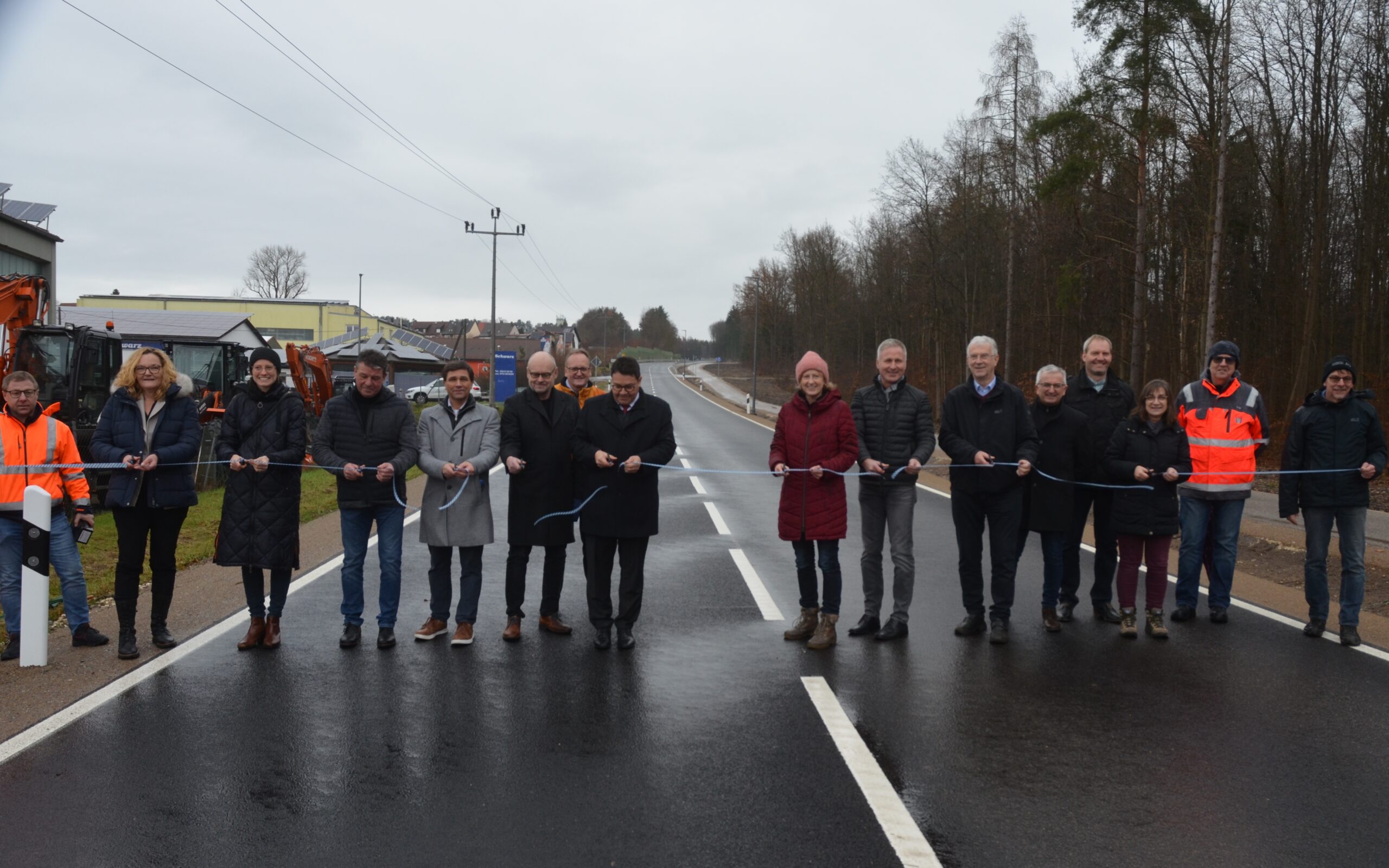 Seit Mitte des Jahres läuft die Sanierung der Industriestraße. Jetzt, kurz vor Weihnachten, wurde der Bauabschnitt 2, zwischen dem Gewerbegebiet an der Knappenstraße und dem Kreisverkehr an der SAD 9 fertiggestellt. „Das ist eine wichtige Botschaft für die Firmen im Industriegebiet und die 5000 Einpendler“, betonte Bürgermeister Falter bei regnerischem Wetter. Die Verkehrsfreigabe der Hauptverkehrsader ist eine große Gemeinschaftsleistung. Falter dankte den Planern und der ausführenden Baufirma Dankerl. Christian Faderl vom Ingenieurbüro „Renner + Hartmann“ hob in einem Statement die verbesserte Leistungsfähigkeit der Straße hervor, auf der zwei unterschiedliche Fahrbahndecken eingebaut wurden. Von den rund 3,5 Millionen Euro veranschlagten Kosten wurden jetzt 1,75 Millionen Euro verbaut. „Die Arbeiten liegen im Zeitplan, wenngleich man mit verschiedenen Problemen konfrontiert war“, stellte Faderl fest.