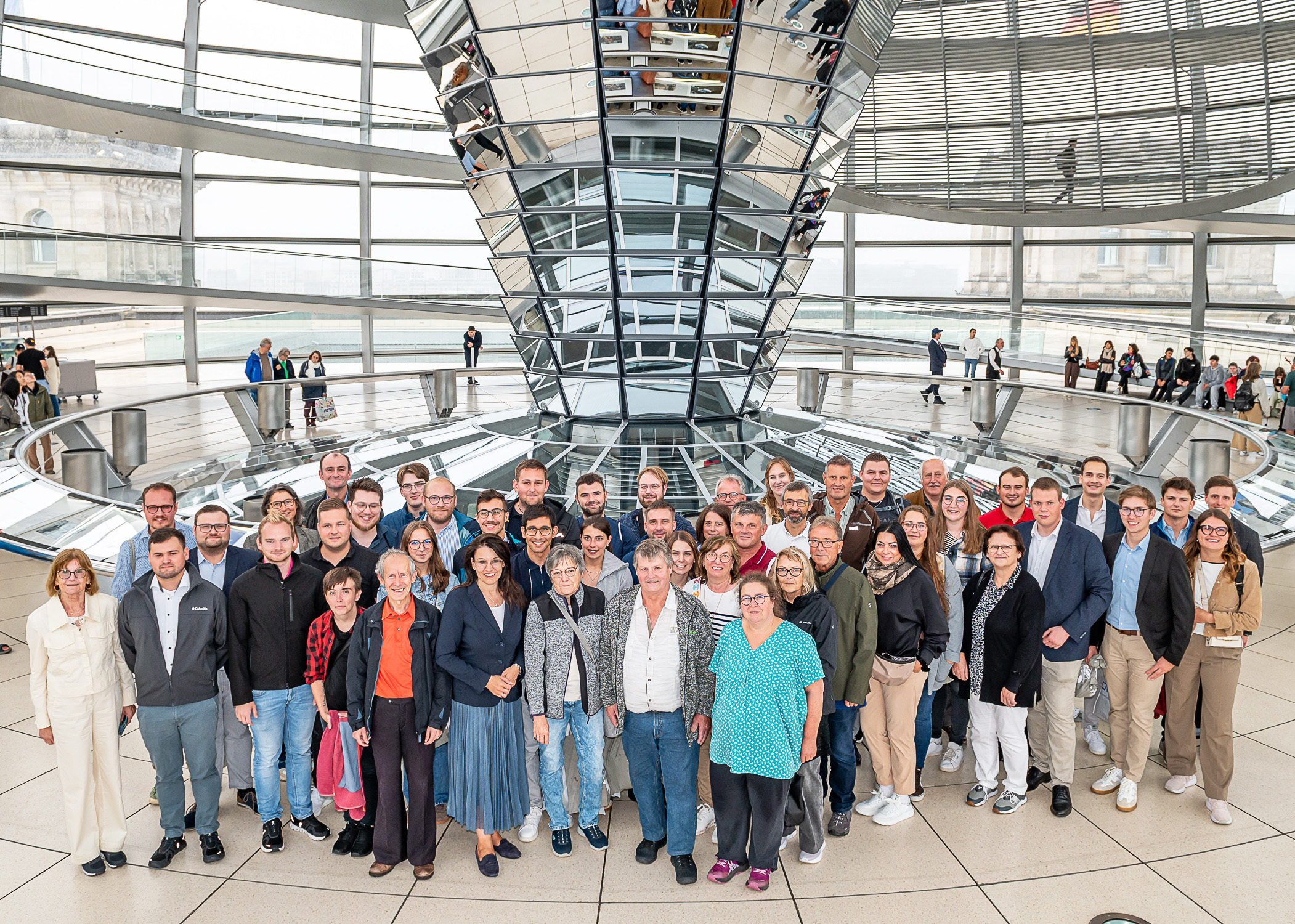 abwechslungsreiches und intensives Programm mit vielen Höhepunkten. Direkt nach der Ankunft startete das Programm mit einer exklusiven Führung durch das Olympiastadion, bei der die Gäste eines der bedeutendsten Bauwerke Berlins aus nächster Nähe erleben konnten. Ein Besuch im Presse- und Informationsamt der Bundesregierung eröffnete am nächsten Tag das vielseitige Programm. Im Anschluss erhielt die Gruppe Zugang zum Deutschen Bundestag, mit einer Besichtigung des Plenarsaals und einem informativen Vortrag über die Aufgaben und die Arbeitsweise des Parlaments. Ein besonderer Höhepunkt war die angeregte Diskussionsrunde mit Frau Englhardt-Kopf, bei der Fragen zu aktuellen Bundesthemen, als auch zu regionalen Themen, direkt angesprochen werden konnten. Von besonderem Interesse waren u.a. die Kosten für den Erwerb von Pkw- und Lkw-Führerscheine, die Möglichkeiten zur Förderung des Mittelstandes, der demografische Wandel, der Abbau von Bürokratie, Fragen zur Grenzsicherung und zur Migrationspolitik. Im Anschluss an die Diskussion hatten die Teilnehmer die Möglichkeit die Dachterrasse des Reichstages zu besichtigen. Den Tag rundete eine exklusive Führung durch das Bundeskanzleramt ab, welches eines der größten und markantesten Regierungsgebäude Europas, gelegen im Spreebogen nahe dem Reichstag, ist. Am folgenden Tag stand ein Besuch im Dokumentationszentrum Topographie des Terrors auf dem Programm, bevor eine Stadtrundfahrt zu politischen Sehenswürdigkeiten das Erleben der