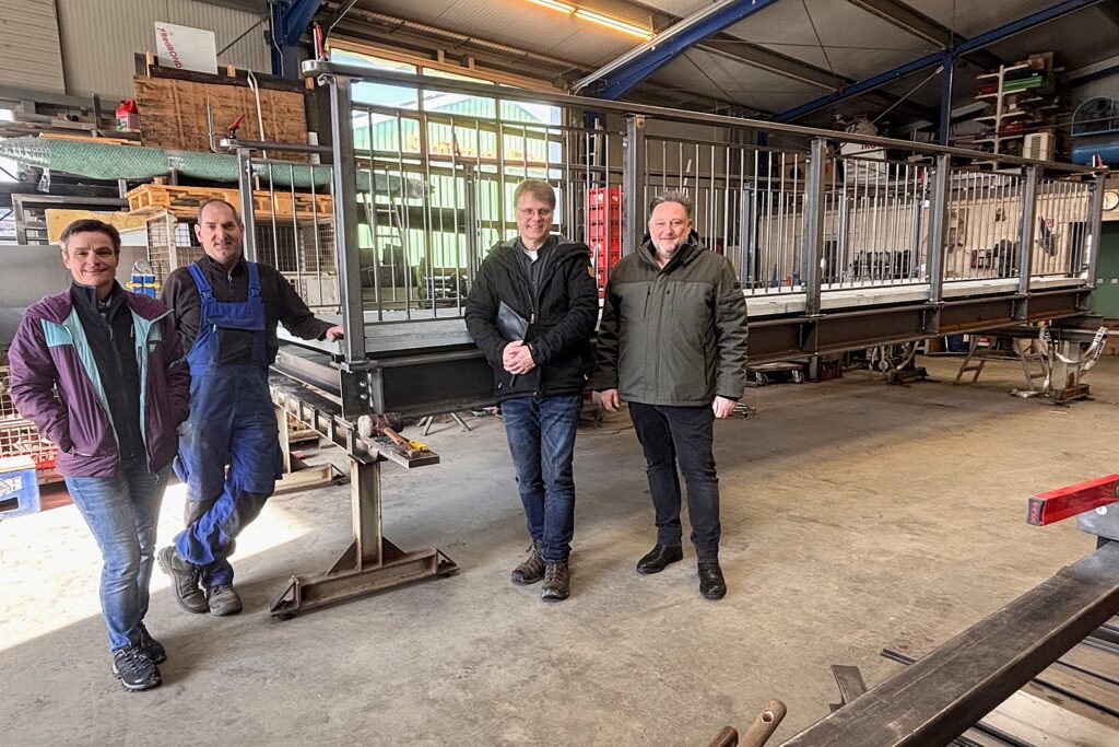 Zum Beginn der Arbeiten machten sich Bürgermeister Thomas Beer, Bauamtsleiterin Sabine Eichinger, Vertreter der Firma Strabag sowie „Brückenbauer“ Josef Wilhelm von der Schlosserei Duschinger ein gemeinsames Bild von der Situation vor Ort. Dabei wurde deutlich, dass die Maßnahme nun sichtbar Fahrt aufnimmt. Während die Tiefbauarbeiten im Bereich des Bachbetts laufen, wird die neue Stahlbrücke in der Schlosserei bereits gefertigt.